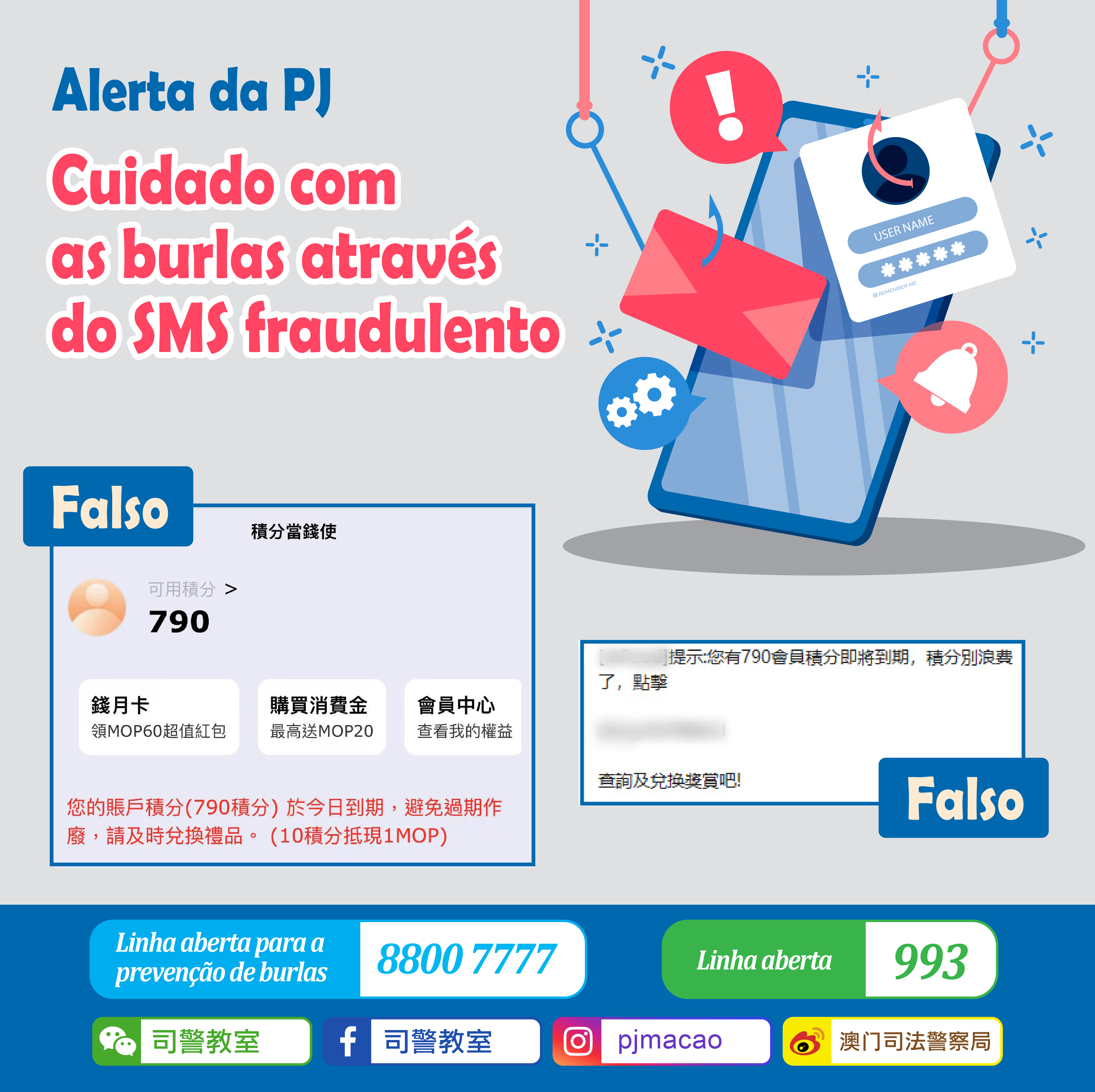 Tendo em conta a alta tendência da ocorrência de casos de fraude cibernética e de telecomunicações, reitera-se o apelo aos cidadãos para que, quando receberem um SMS com link desconhecido seja qual for a identidade alegada, tenham cuidado e não cliquem qualquer link presente nesse SMS nem deem quaisquer dados pessoais, nomeadamente informações acerca do cartão de crédito, senha, ou código de verificação da transação, a fim de proteger os dados da conta bancária e de cartão crédito.