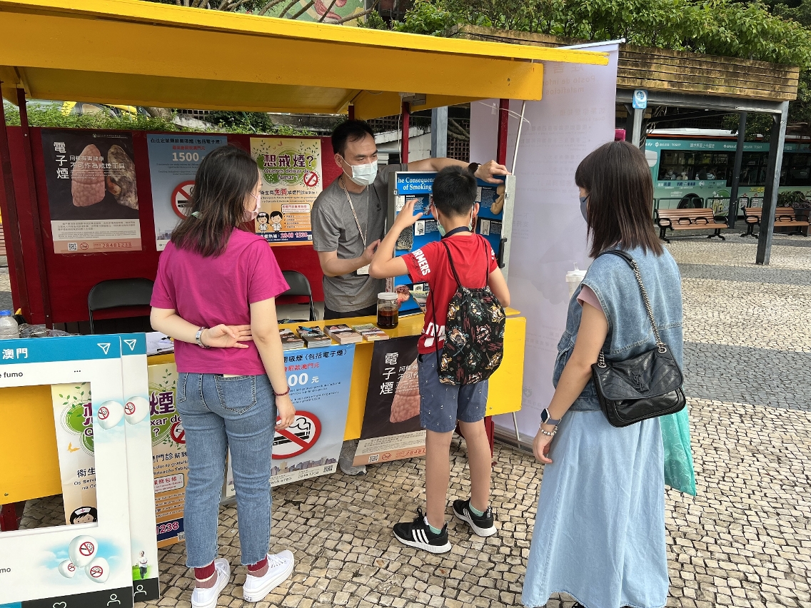 Por outro lado, foram realizadas, pelos Serviços de Saúde, durante o período em que decorre o “Dia Mundial Sem Tabaco”, as actividades de “Posto de Consulta sobre os Malefícios do Tabagismo” durante as tardes de cada sábado no mês de Maio, em alguns locais, por turno, tais como a Praça do Tap Seac, a Zona de Lazer da Rua do General Ivens Ferraz, ao lado do Jardim da Cidade das Flores de Taipa, o Parque Urbano da Areia Preta, entre outros onde foram realizadas diversas actividades relacionadas com a prevenção do tabaco, nomeadamente, a prestação da informação sobre os Malefícios do Tabagismo junto aos residentes, o teste gratuito de dependência de nicotina destinado a fumadores que pretendem desistir de fumar, o serviço de medição da pressão arterial, bem como a promoção de serviços de consulta externa de cessação tabágica, dos Serviços de Saúde. A par disso, as placas de exibição e utensílios de modelo pedagógico são colocadas no local em causa, além da disponibilização de adereço sob o tema de “Ajude a criar um ambiente sem fumo para a próxima geração” com os quais os residentes podem tirar fotografias.