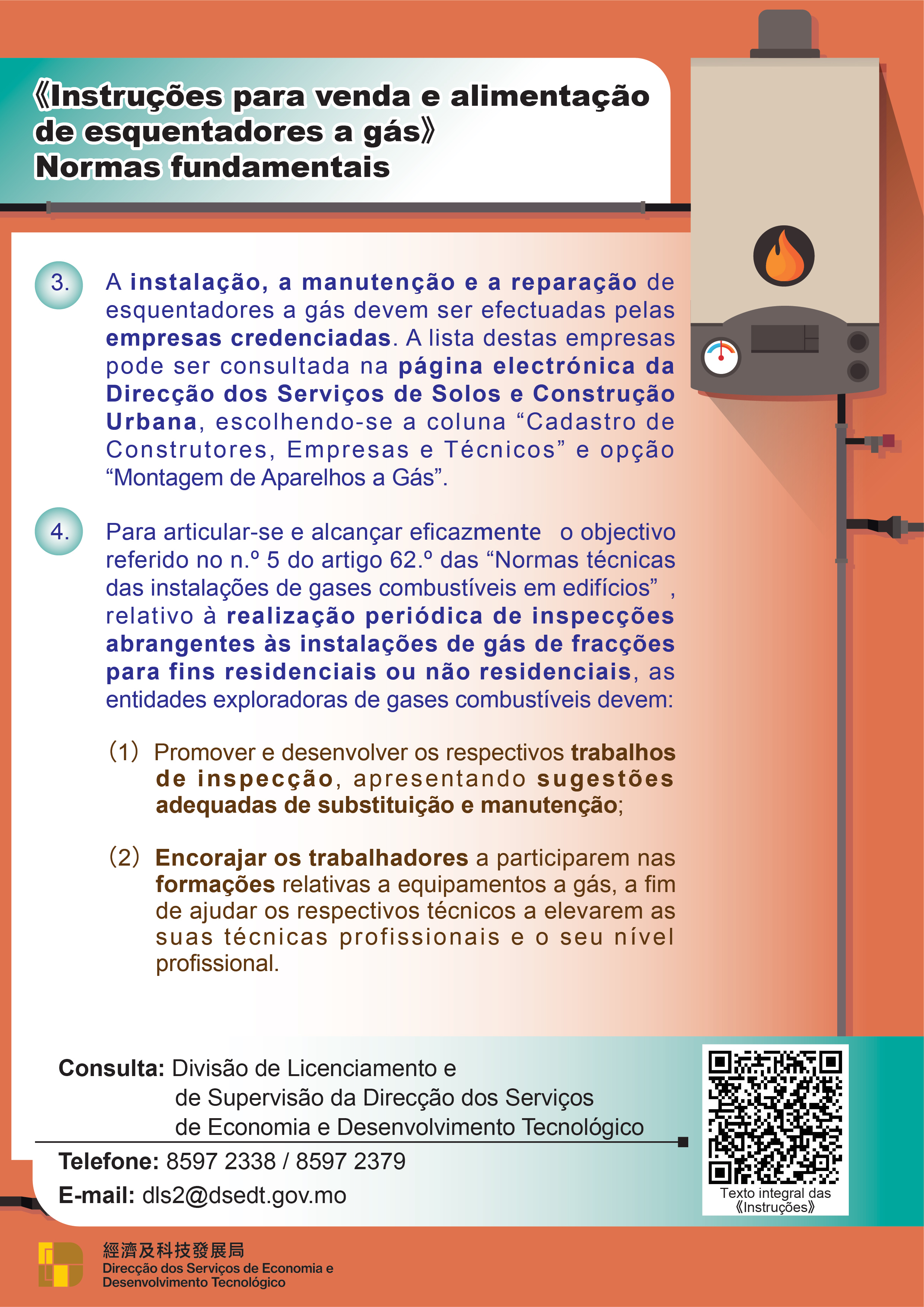 Para mais informações sobre as “Instruções para venda e alimentação de esquentadores a gás”, os interessados podem consultar a página electrónica da DSEDT ( https://www.dsedt.gov.mo ) ou digitar o código QR.