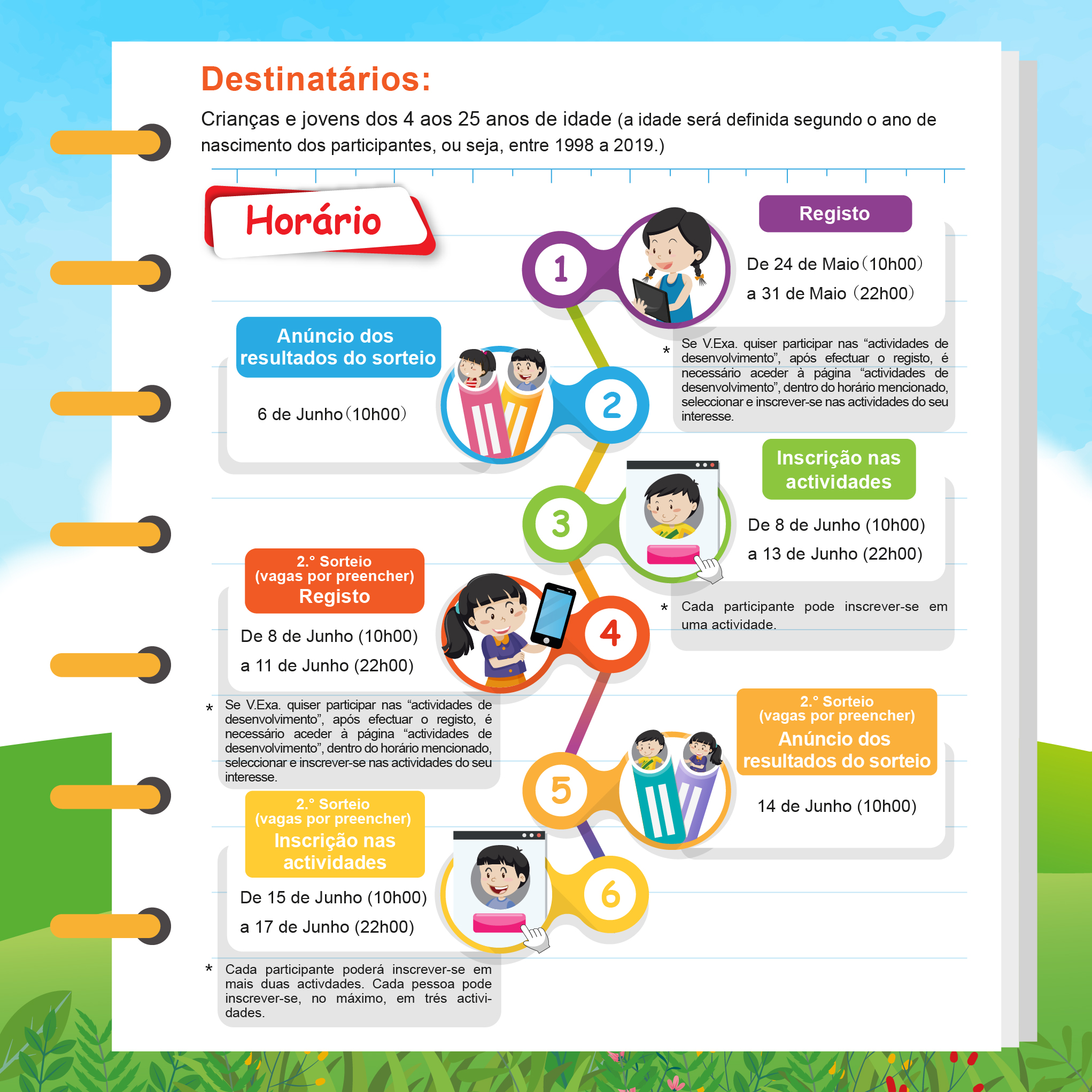 Os sorteados poderão aceder à página electrónica e efectuar a inscrição de acordo com a hora atribuída até 22h00 do dia 13 de Junho. Poderão aceder à página electrónica para verificar e seleccionar as actividades desejadas antes da inscrição, e colocar as actividades interessadas no “meu favorito”, assim poderá poupar tempo no acto de inscrição.