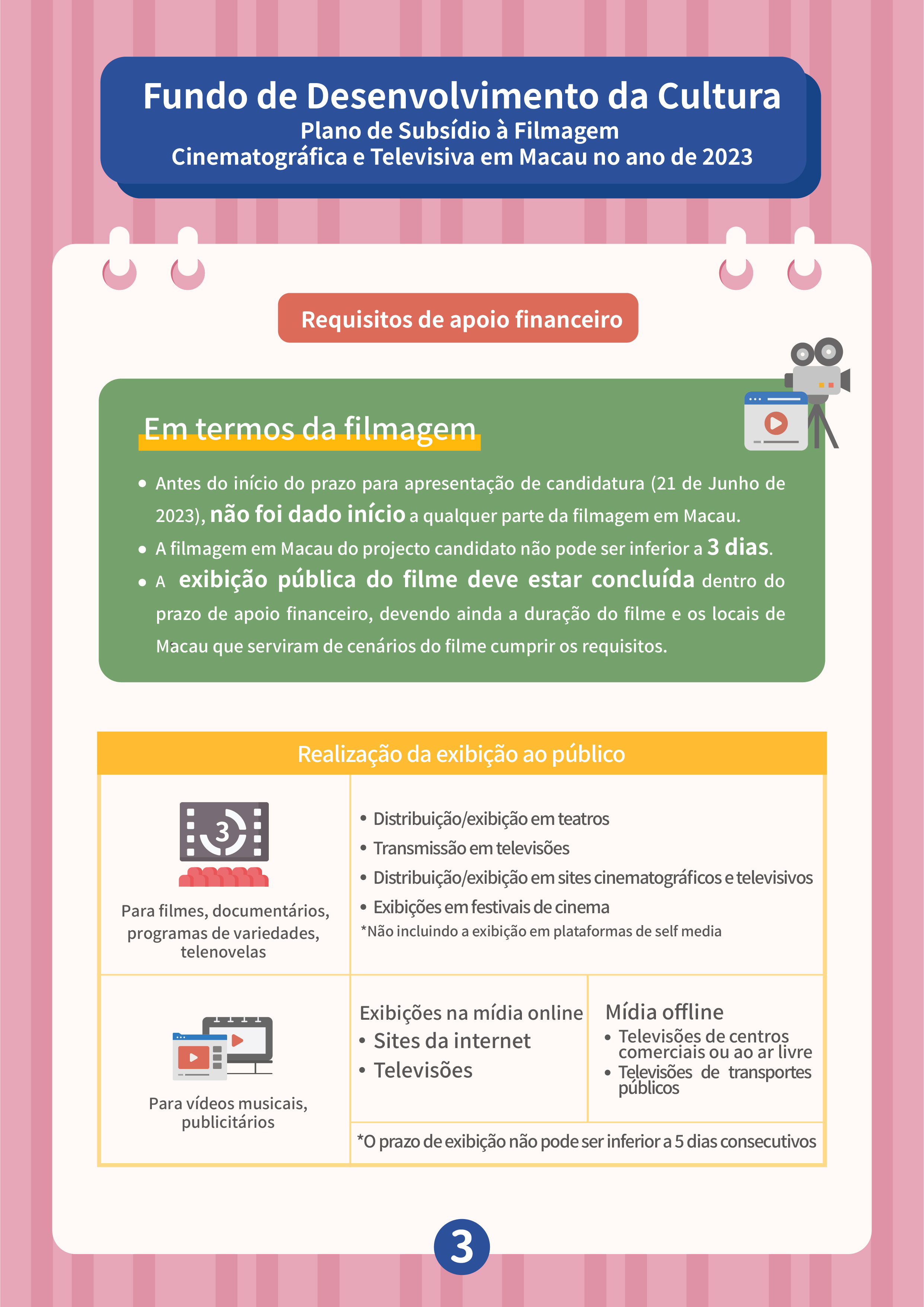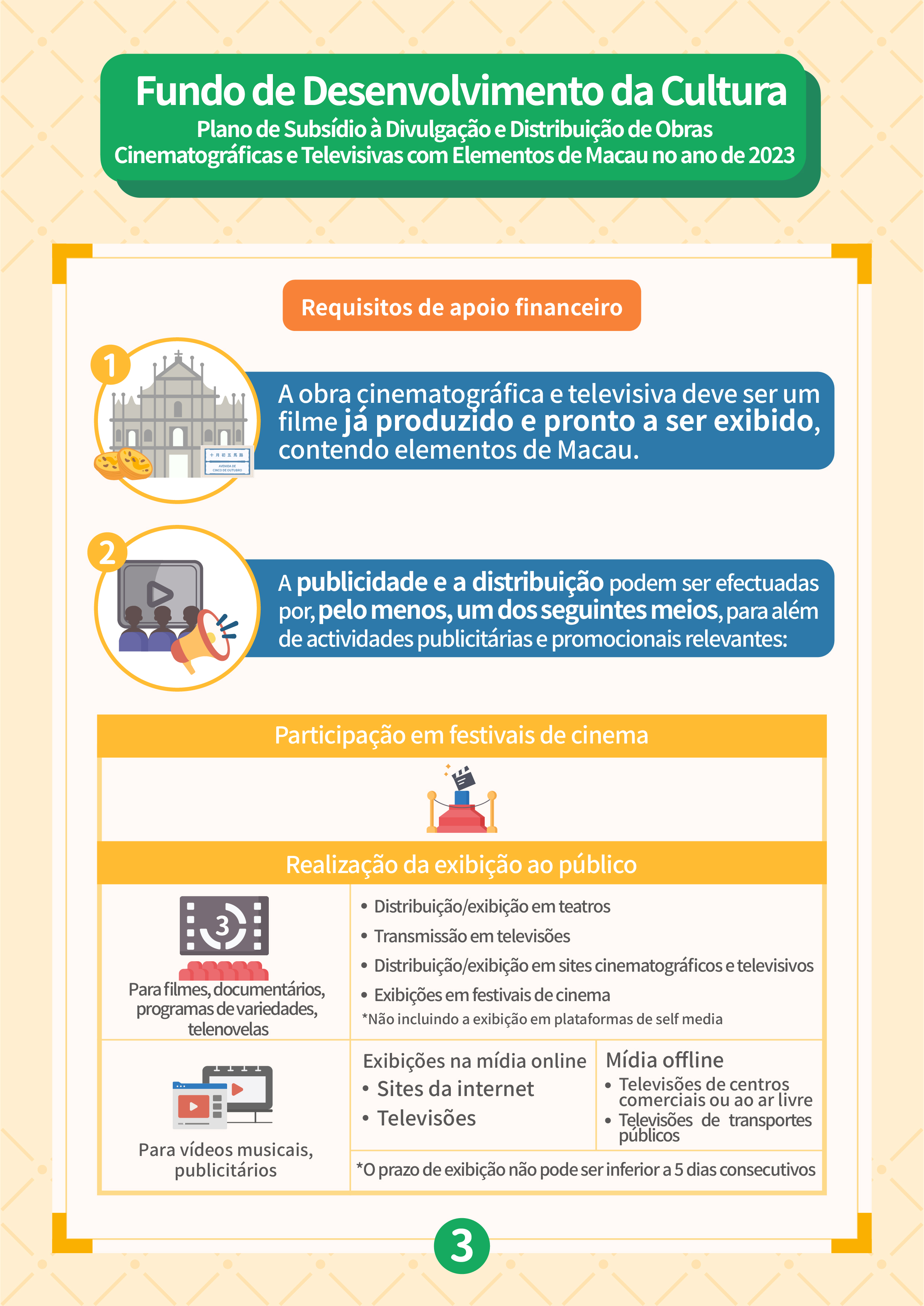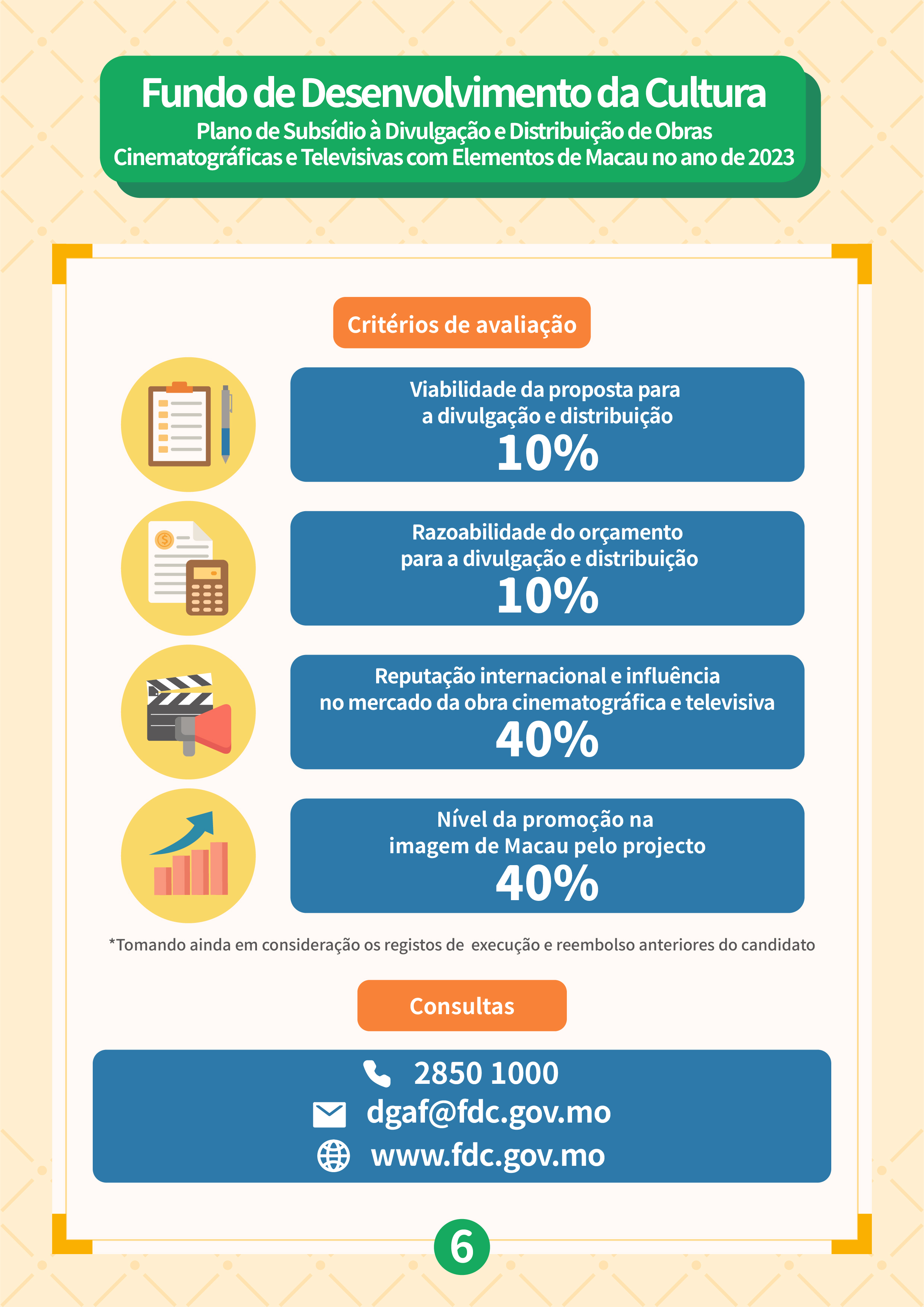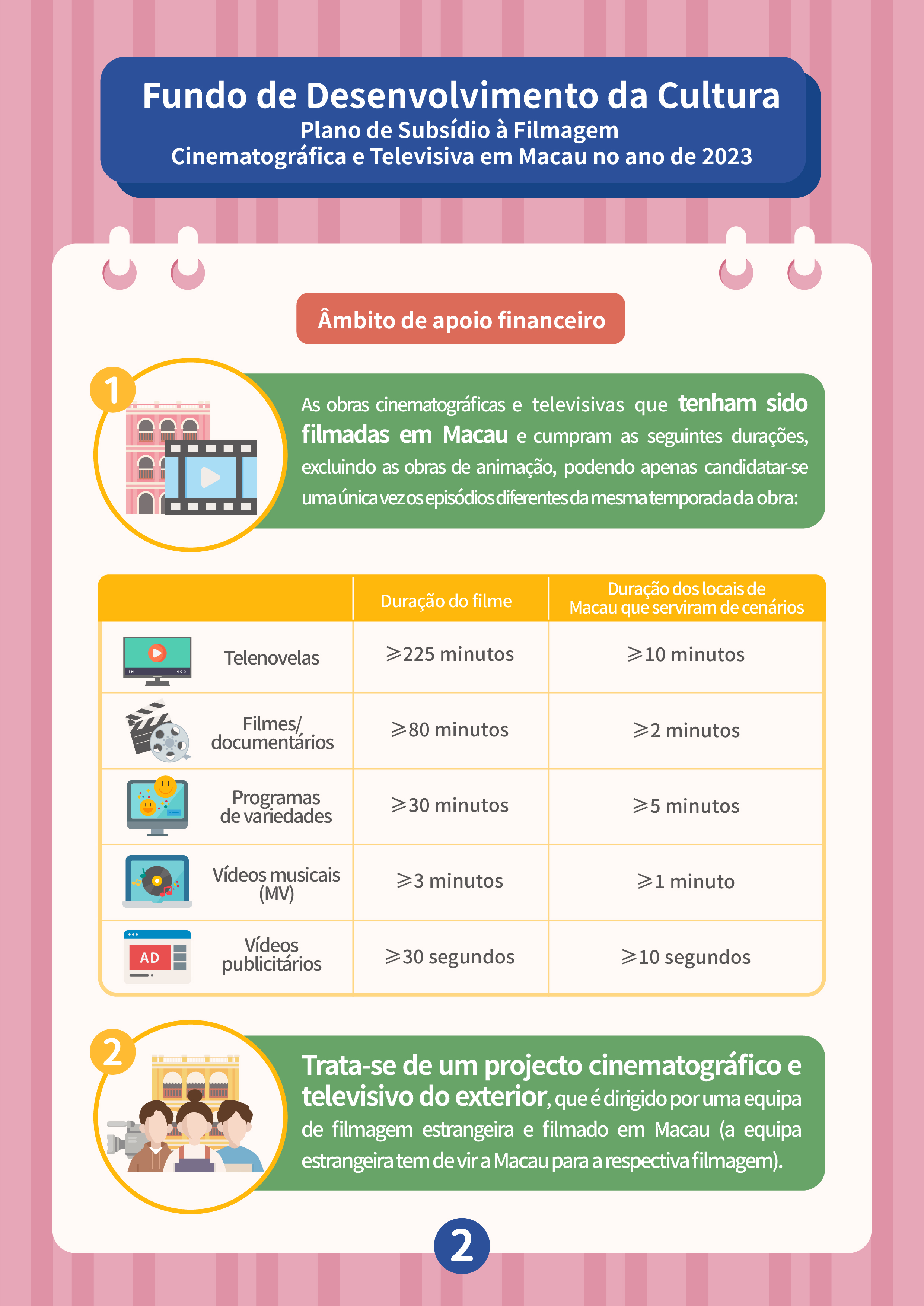 O “Plano de subsídio à filmagem cinematográfica e televisiva em Macau” tem por objectivo atrair equipas estrangeiras para a filmagem em Macau, e promover a imagem da cidade e melhorar a reputação internacional de Macau, através de produções cinematográficas e televisivas, proporcionando mais oportunidades para as empresas locais desta área a participarem nas filmagens de produções estrangeiras. Serão aceites projectos estrangeiros que ainda não tenham sido filmados em Macau antes do prazo para apresentação de candidaturas (21 de Junho de 2023) e o tempo de filmagem em Macau não será inferior a três dias, sendo dirigidos por equipas de filmagem estrangeiras, as quais terão de vir a Macau para a respectiva filmagem. As candidaturas devem ser apresentadas pelos empresários comerciais que sejam unidades de produção em Macau. Dentro do prazo de apoio financeiro, a exibição pública do filme deve estar concluída, do qual, a duração e os locais de Macau que serviram de cenários do filme não podem ser inferiores ao limite de tempo especificado. O valor máximo a conceder é de 40% das despesas orçamentais para a realização da filmagem em Macau, até 2 milhões de patacas.