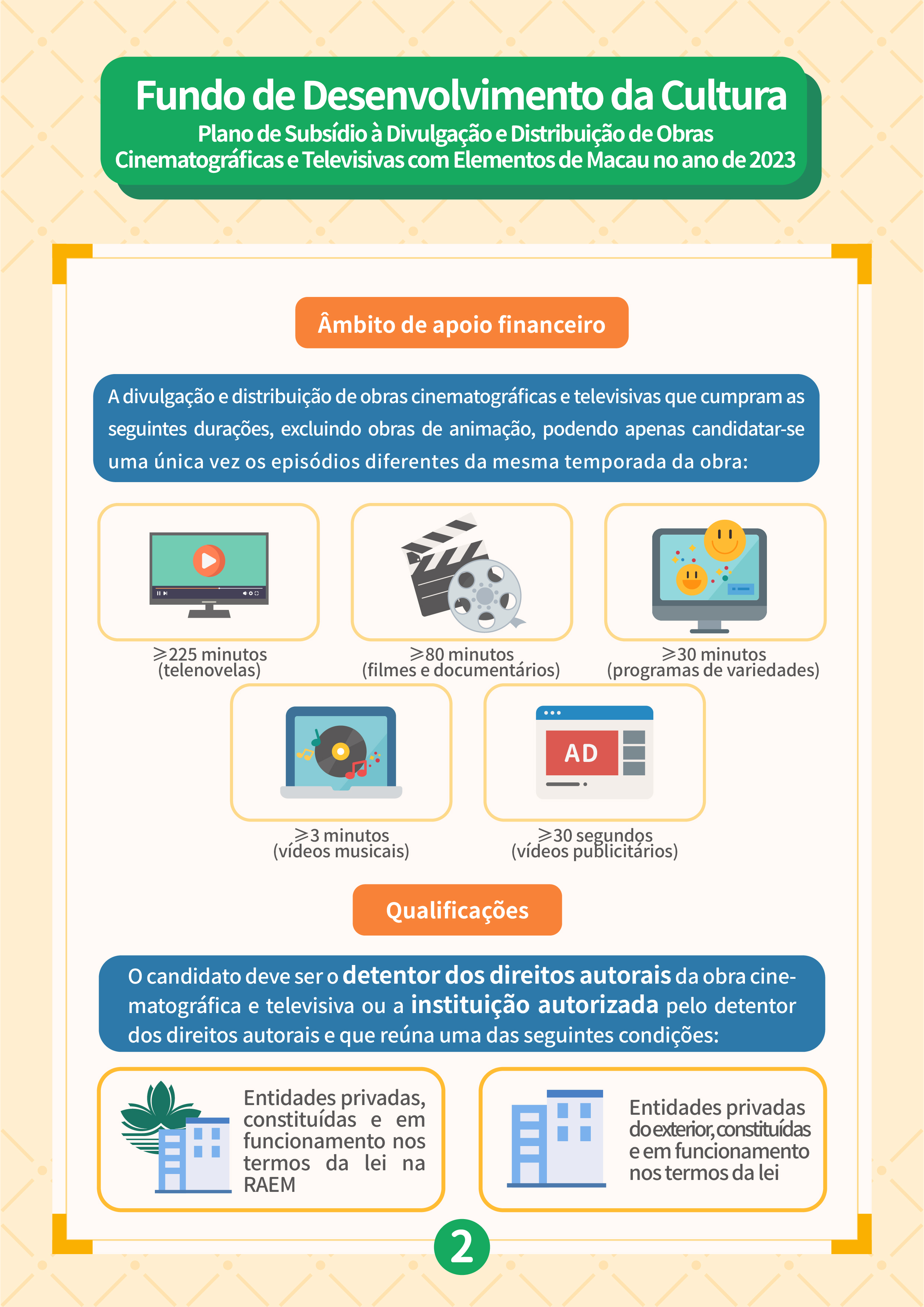 Serão aceites as candidaturas aos dois planos de apoio de 21 de Junho a 29 de Dezembro de 2023, sem quota máxima. Se o orçamento dos planos for esgotado, o prazo para a apresentação de candidaturas termina mais cedo, cujas informações serão publicadas na página electrónica do FDC. Os tipos de obras a financiar no âmbito dos dois planos incluem telenovelas, filmes, documentários, programas de variedades, vídeos musicais e publicitários, com excepção das obras de animação.
