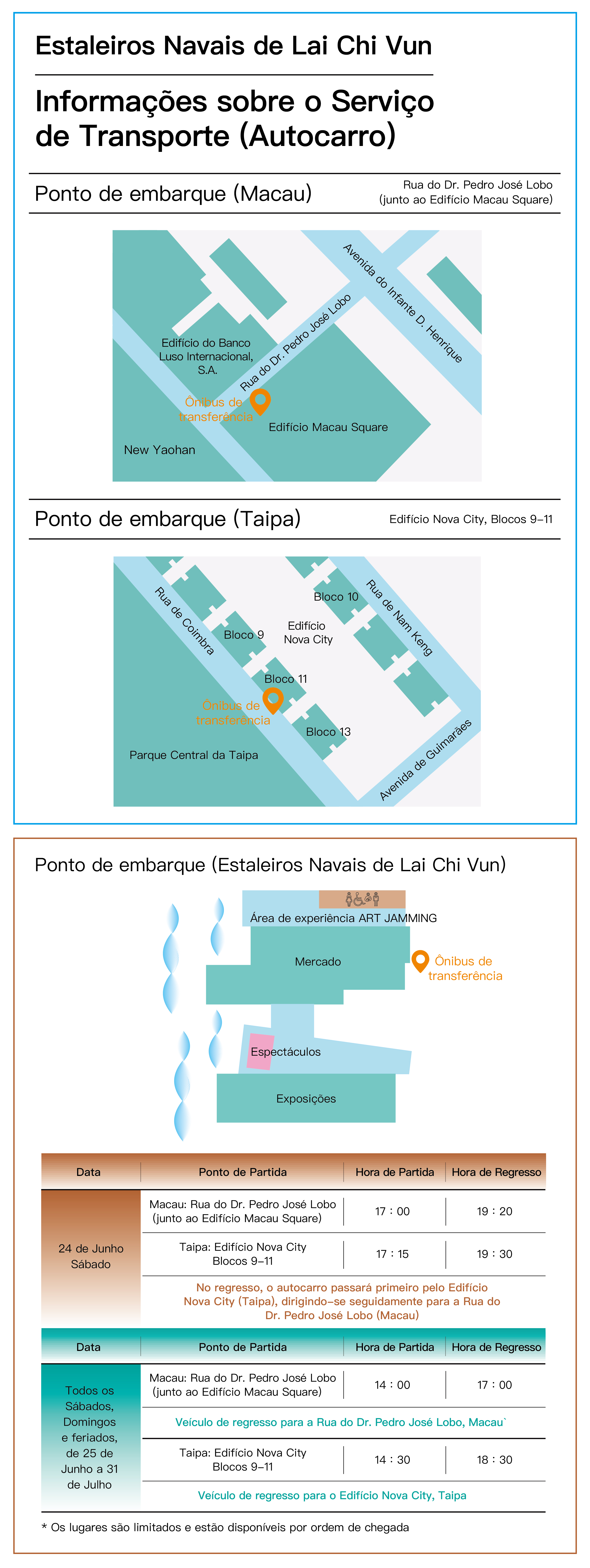 A fim de facilitar a deslocação dos residentes e visitantes aos Estaleiros Navais de Lai Chi Vun para assistir à cerimónia de inauguração, no dia 24 de Junho (Sábado), será disponibilizado um serviço de transporte gratuito (autocarro) a partir da Rua do Dr. Pedro José Lobo, em Macau (partida às 17:00 horas), e a partir do Edifício Nova City, Blocos 9-11, na Taipa (partida às 17:15 horas). O ponto de partida para a viagem de regresso será em frente à feira junto aos estaleiros, com partida às 19:20 e 19:30 horas, respectivamente. Todos os Sábados, Domingos e feriados, de 25 de Junho a 31 de Julho, haverá autocarros especiais para o público nos locais já referidos, estando disponível um número limitado de lugares, os quais serão ocupados por ordem de chegada. (Na Rua do Dr. Pedro José Lobo, o autocarro partirá às 14:00 horas, estando a viagem de regresso prevista para as 17:00 horas. Por sua vez, no Edifício Nova City, o autocarro partirá às 14:30 horas, estando a viagem de regresso prevista para as 18:30 horas.)