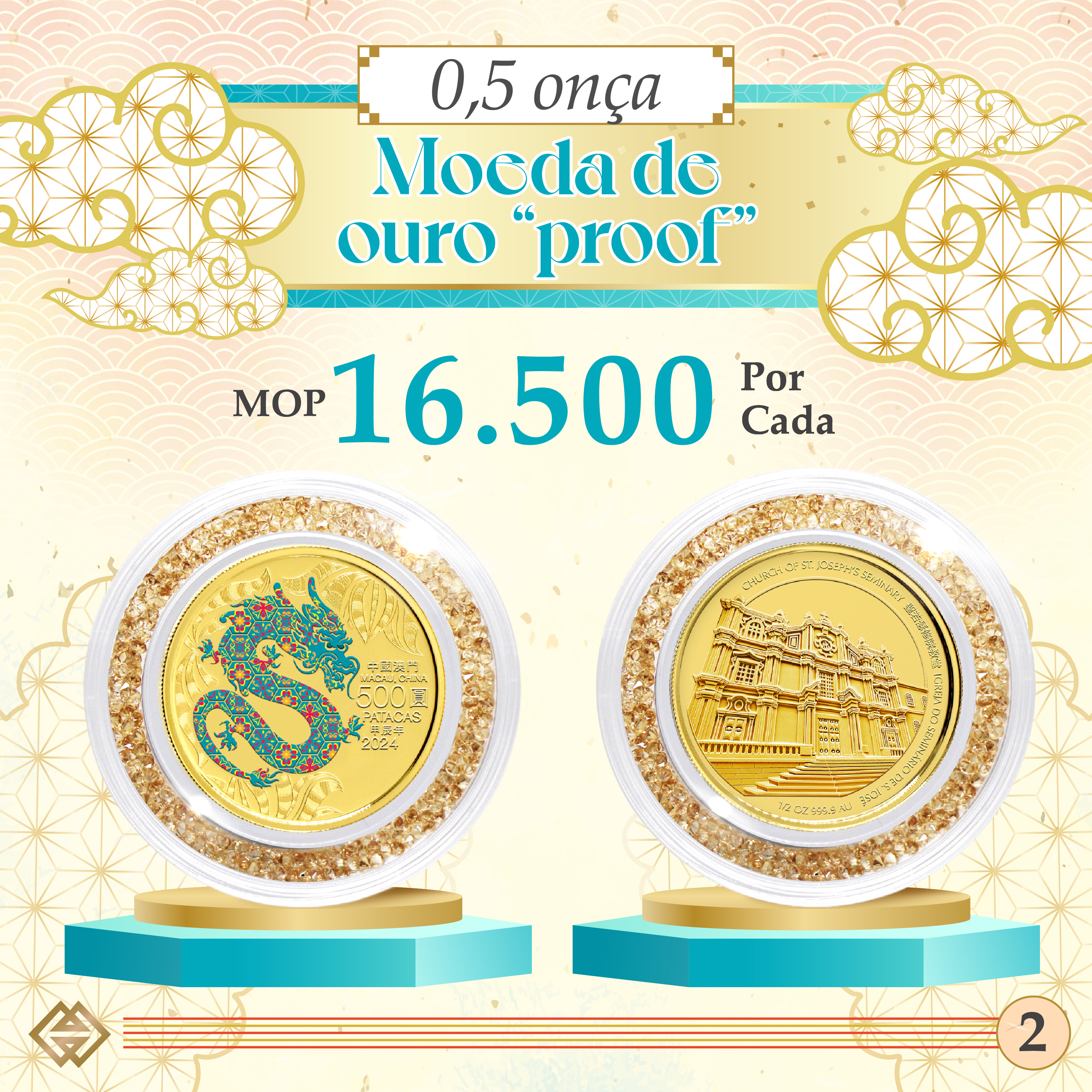 O anverso da moeda comemorativa do Ano Novo Lunar do Dragão é constituído por um desenho de um signo zodiacal tradicional chinês relativo ao ano lunar, feito de azulejos desenhados de cores variadas e de estilo português, enquanto que no reverso da moeda comemorativa, o desenho é apresentado de uma perspectiva ascedente, através da nova tecnologia de escultura relevo, esculpido num local do Património Cultural de Macau, Igreja do Seminário de S. José. Ora, as moedas comemorativas do Ano Lunar do Dragão são constituídas por uma moeda de prata “proof” com 1 onça, uma moeda de prata “proof” com 5 onças e uma moeda de ouro “proof” com 0,5 onça. Os preços dos três tipos de moedas comemorativas são 1.380 patacas, 8.000 patacas e 16.500 patacas, respectivamente.