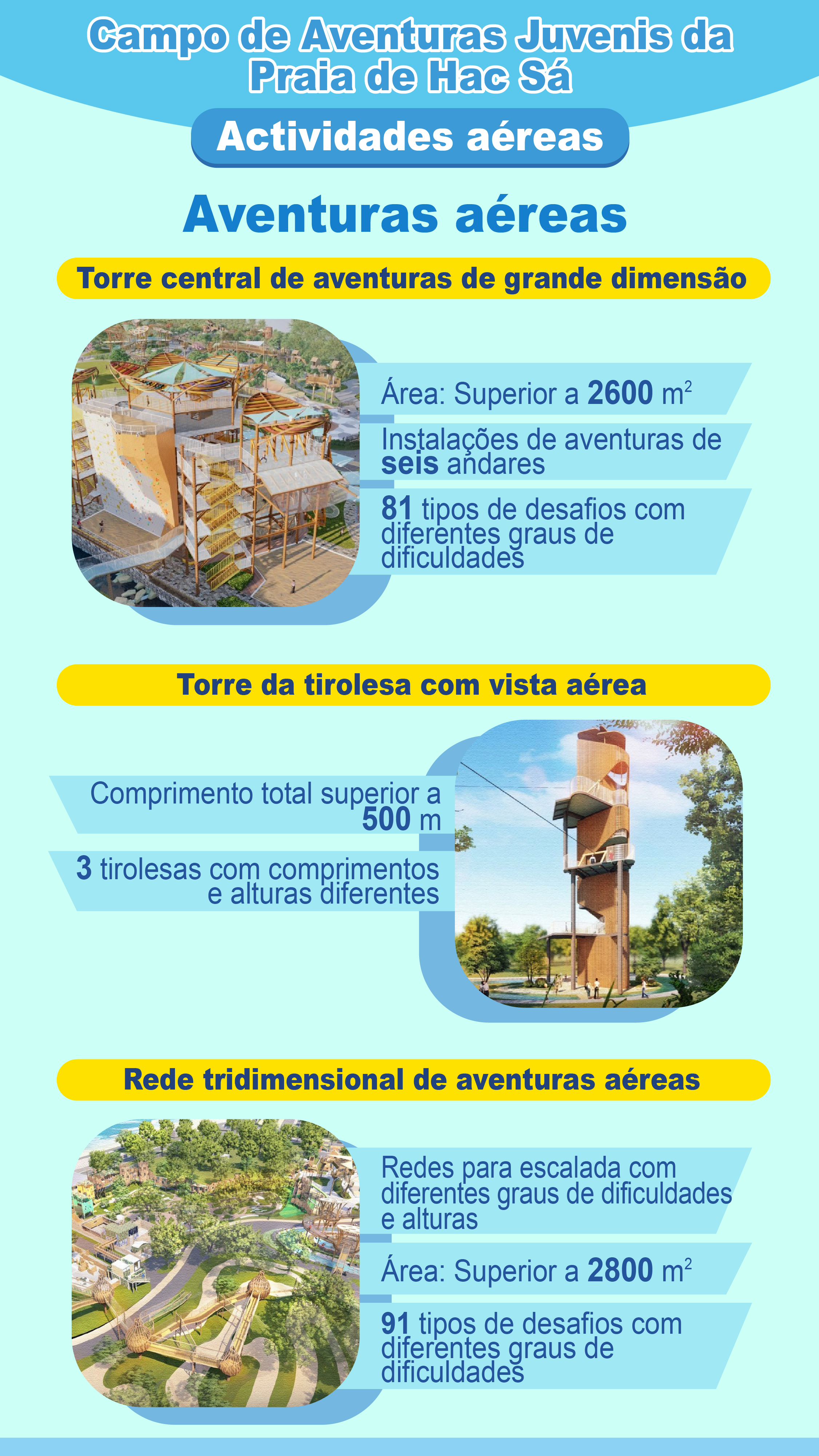 O Campo de Aventuras Juvenis da Praia de Hac Sá, com uma área total de 10 hectares, além de contar com 12 áreas funcionais temáticas e mais de 200 modalidades de aventura “aquática, terrestre e aérea”, nele será construída uma série de instalações complementares, tais como infra-estruturas de prevenção de inundações e de drenagem, parques de estacionamento, centro de actividades e espaço de restauração, a fim de criar o maior campo de aventuras em Macau e nas regiões vizinhas, oferecendo experiências de aventura “aquática, terrestre e aérea” tridimensional a crianças, adolescentes e jovens.