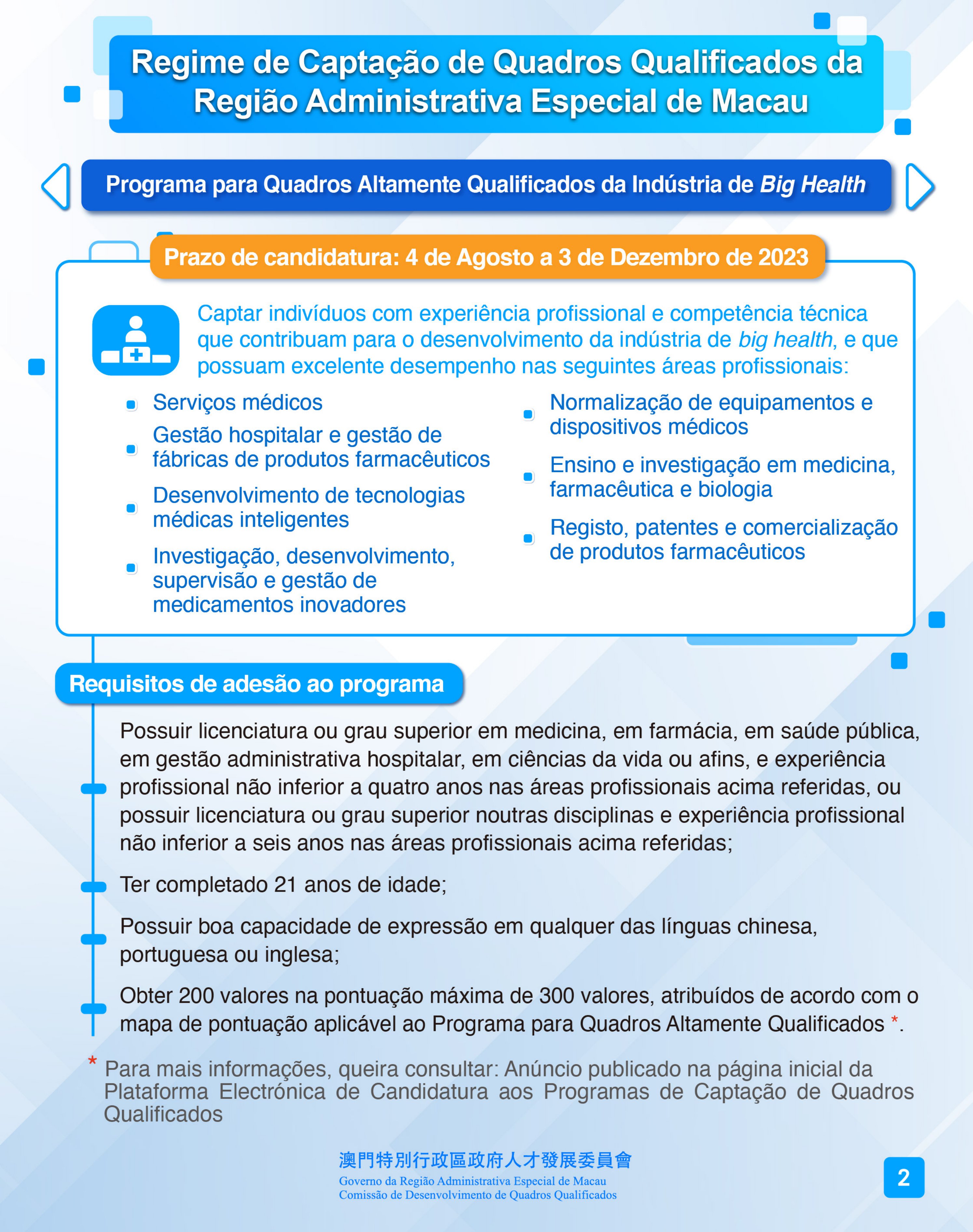 De 4 de Agosto a 3 de Dezembro de 2023, encontra-se aberto o período de candidaturas ao Programa para Quadros Altamente Qualificados da Indústria de Big Health, que visa captar indivíduos com experiência profissional e competência técnica que contribuam para o desenvolvimento da indústria de big health, e que possuam excelente desempenho nas seguintes áreas profissionais: 1) serviços médicos; 2) gestão hospitalar e gestão de fábricas de produtos farmacêuticos; 3) desenvolvimento de tecnologias médicas inteligentes; 4) investigação, desenvolvimento, supervisão e gestão de medicamentos inovadores; 5) normalização de equipamentos e dispositivos médicos; 6) ensino e investigação em medicina, farmacêutica e biologia; 7) registo, patentes e comercialização de produtos farmacêuticos. Os candidatos têm de preencher, cumulativamente, os seguintes requisitos: possuir licenciatura ou grau superior em medicina, em farmácia, em saúde pública, em gestão administrativa hospitalar, em ciências da vida ou afins, e experiência profissional não inferior a quatro anos nas áreas profissionais acima referidas, ou possuir licenciatura ou grau superior noutras disciplinas e experiência profissional não inferior a seis anos nas áreas profissionais acima referidas; ter completado 21 anos de idade; possuir boa capacidade de expressão em qualquer das línguas chinesa, portuguesa ou inglesa; obter 200 valores na pontuação máxima de 300 valores, atribuídos de acordo com o mapa de pontuação aplicável ao programa.