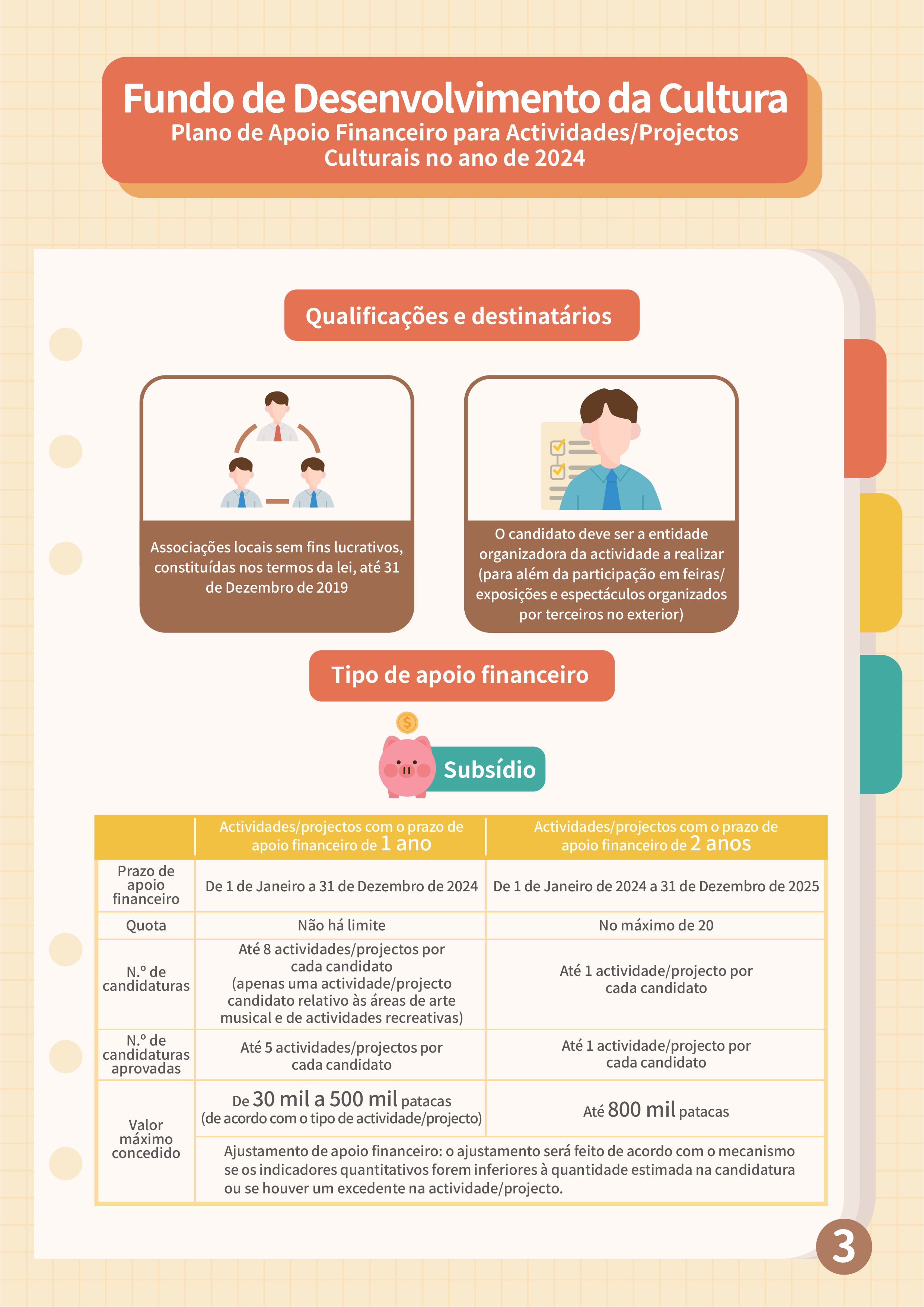 O Fundo de Desenvolvimento da Cultura (FDC) lança o “Plano de apoio financeiro para actividades/projectos culturais no ano de 2024” e o “11.º Plano de subsídio à criação de amostras de design de moda”, com vista a enriquecer a atmosfera cultural dos bairros comunitários e promover o desenvolvimento da indústria de design de moda em Macau.