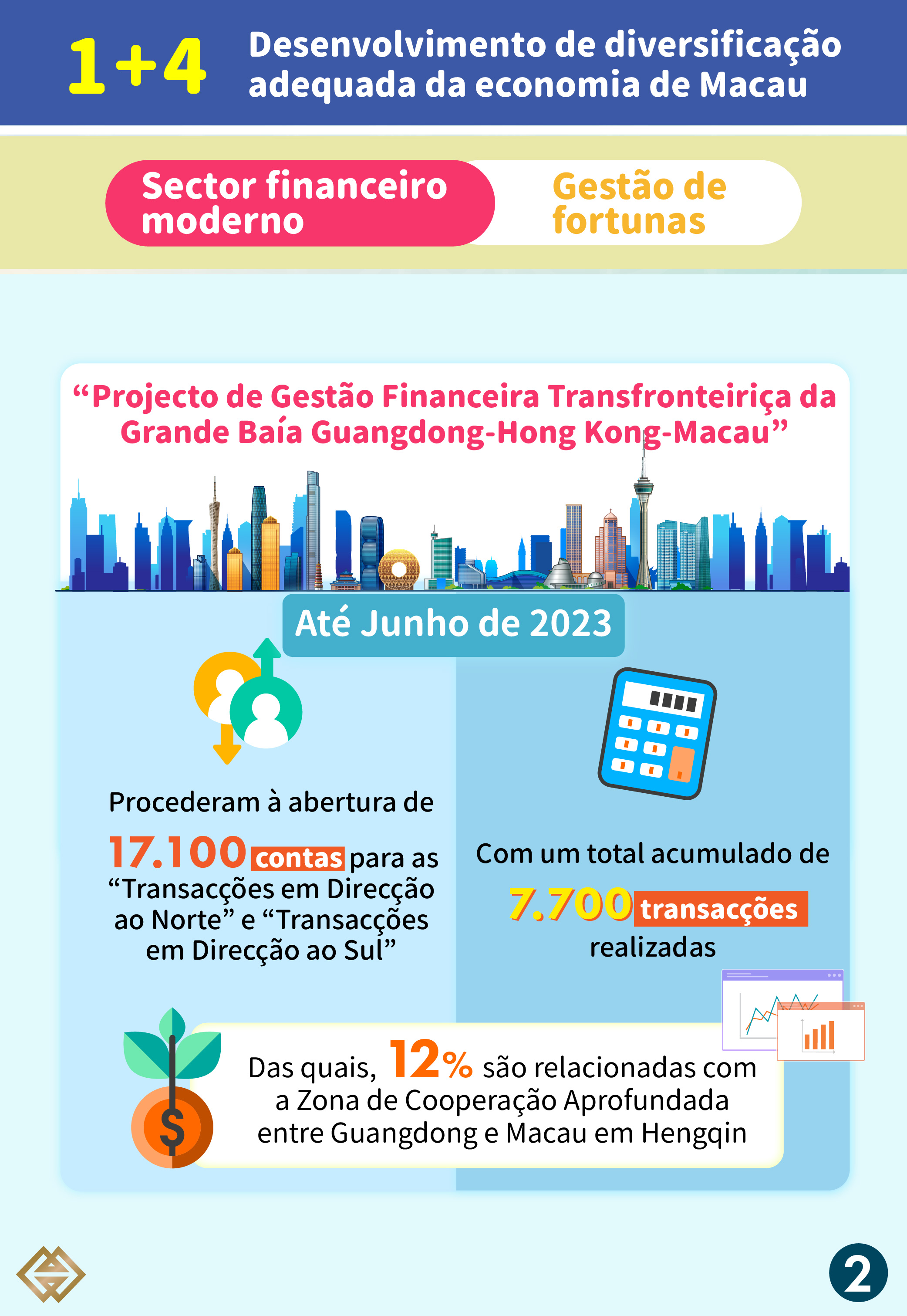Actualmente, o total de activos do sector financeiro de Macau aumentou de 2.176,2 mil milhões de patacas, registado antes da pandemia para 2.911,9 mil milhões de patacas no final do primeiro trimestre de 2023. Com a optimização constante do ambiente do mercado e as oportunidades criadas pelo desenvolvimento conjunto da Zona de Cooperação Aprofundada, o sector financeiro poderá aumentar o seu potencial de crescimento, sob uma abordagem orientada para o mercado, promovendo-se assim o desenvolvimento da diversificação adequada da economia de Macau.