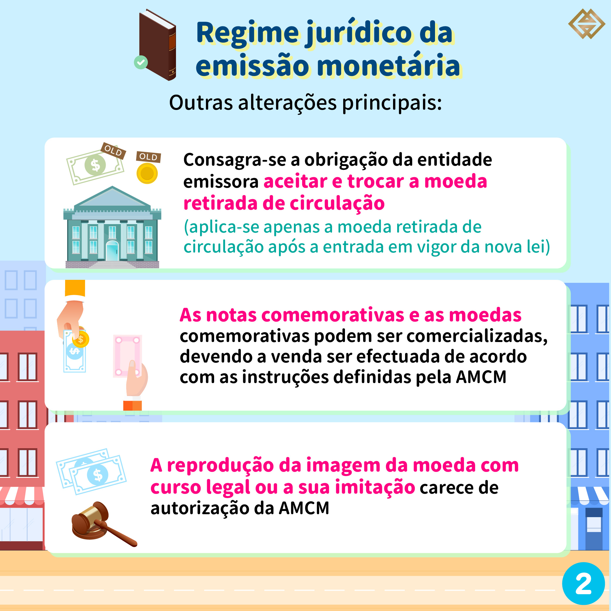 Tendo em conta as práticas nas zonas vizinhas, e atendendo às situações concretas da RAEM, após a entrada em vigor da nova lei, mantém-se a obrigação da entidade emissora aceitar e trocar a moeda retirada de circulação, findo o período de transição. Entretanto, foi introduzida uma nova tipologia de notas – as notas comemorativas, sendo que as notas comemorativas e as moedas comemorativas podem ser comercializadas ao público por valor superior ao seu valor facial, devendo a venda ser efectuada de acordo com as instruções definidas pela Autoridade Monetária de Macau (AMCM). A AMCM emitirá as instruções relativas às regras da reprodução da imagem da moeda com curso legal ou da sua imitação.