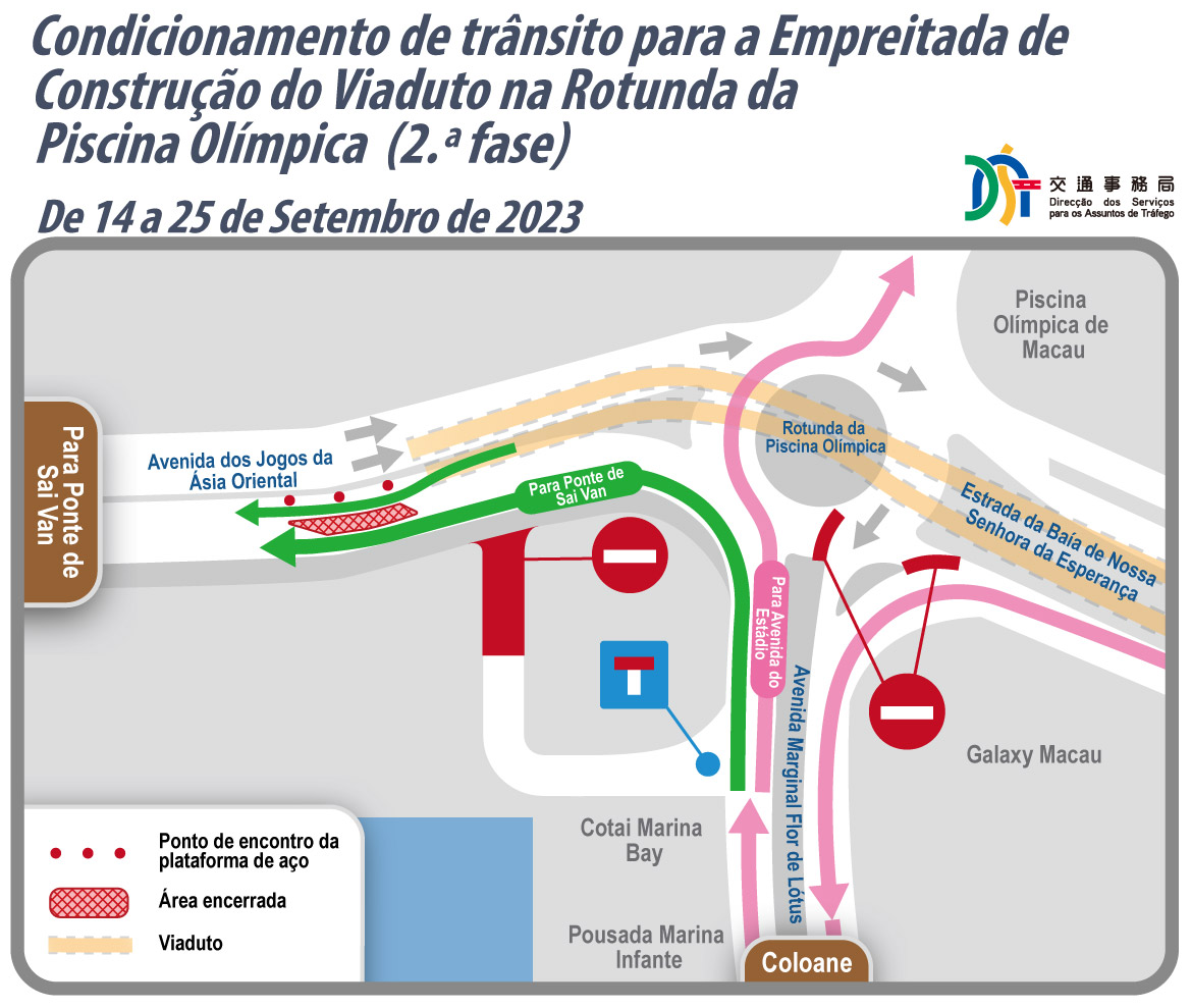 Em articulação com o avanço da empreitada de construção da rampa de acesso sudoeste do viaduto da Rotunda da Piscina Olímpica, é necessário construir uma plataforma provisória de aço no acesso do viaduto da Avenida dos Jogos da Ásia Oriental em direcção à Ponte de Sai Van para a execução da estrutura do pavimento entre dias 2 e 25 de Setembro de 2023, estando a conclusão da obra prevista para o 1.º trimestre de 2024. No referido período, serão implementadas, por troços, as medidas de circulação condicionada de veículos numa parte da Avenida dos Jogos da Ásia Oriental em direcção à Ponte de Sai Van. Por outro lado, as medidas provisórias de trânsito na Rotunda da Piscina Olímpica e o ajustamento provisório relativo aos autocarros mantêm-se até à conclusão dos trabalhos de desmontagem da plataforma de aço, repondo posteriormente a situação inicial.