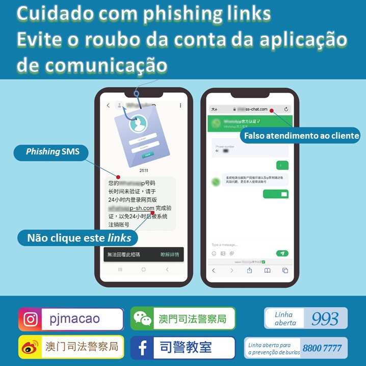 Nos últimos dias, a Polícia Judiciária (PJ) descobriu novamente que há burlões que enviam, de forma aleatória, phishing SMS, simulando serem uma empresa de aplicação de comunicações de telemóvel. As mensagens informam que a conta de mensagens instantâneas da vítima “vai ser cancelada dentro de 24 horas”, para evitá-lo pedem para clicar no link indicado nessa mensagem e completar a verificação num website. Ao clicar esse link, passa-se para o atendimento ao cliente, onde pedem para introduzir informações relativas à conta, a senha e o código de verificação. Dessa forma, os criminosos tentam roubar o uso da conta e outros dados pessoais da vítima.