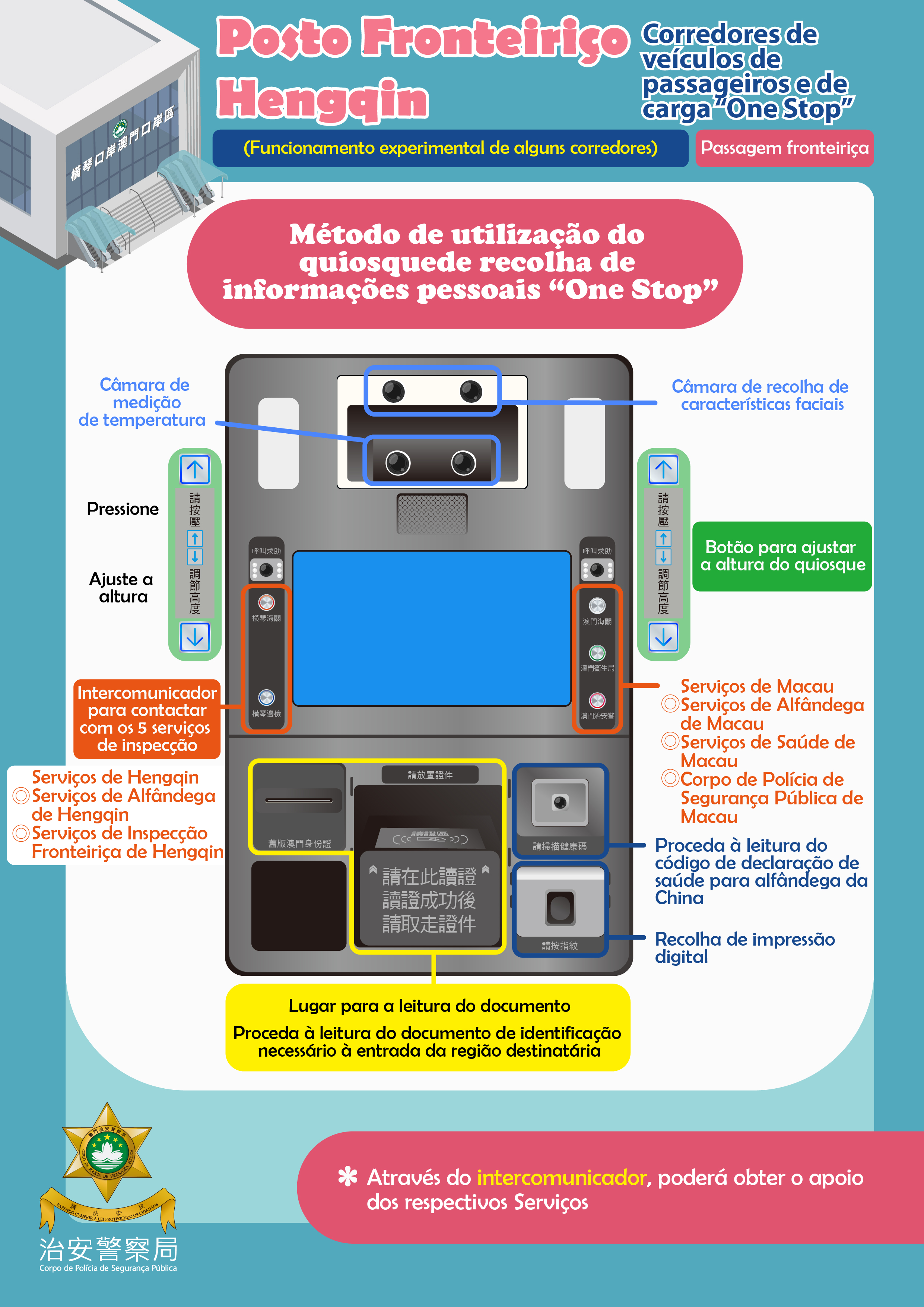 Quando utiliza os corredores de inspecção rápida e automática, os condutores efectuam a leitura do documento de identificação necessário à entrada da região destinatária no Quiosque de recolha de informações pessoais “one stop” da saída fronteiriça (ex.: os residentes de Macau utilizam o Salvo-conduto para deslocação à China para ir a Hengqin, e o BIR de Macau quando voltam para Macau). Solicita-se a atenção, o código QR da “Minha passagem fronteiria ” não pode ser utilizado nos corredores de inspecção rápida e automática.