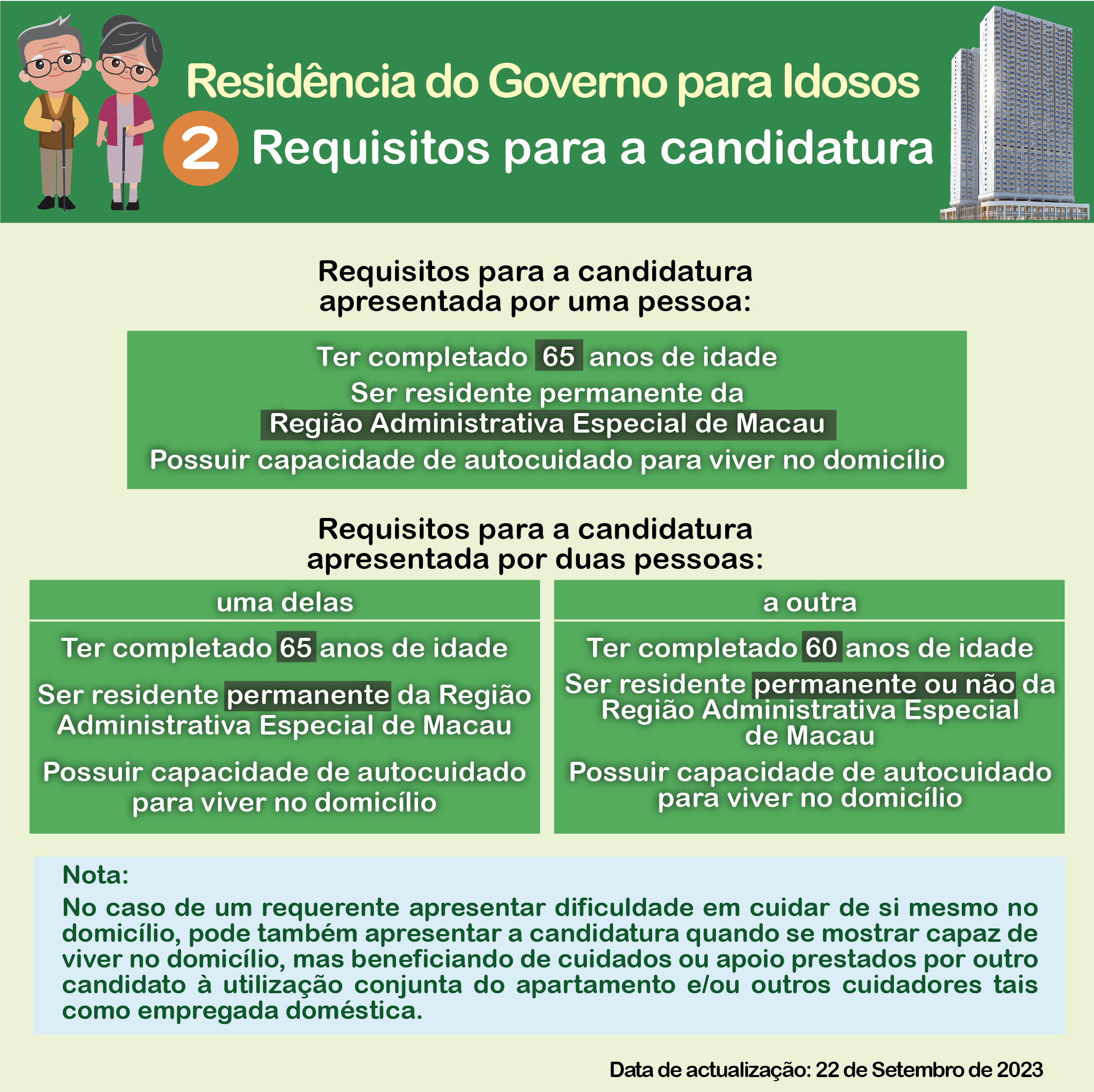 O candidato à utilização da Residência tem que ser residente permanente da RAEM, ter completado 65 anos de idade e possuir capacidade de autocuidado para viver no domicílio. Caso duas pessoas pretendam candidatar-se à utilização de um mesmo apartamento, uma tem de reunir os requisitos atrás referidos e a outra tem de ser residente permanente ou não permanente da RAEM, ter completado 60 anos de idade e possuir capacidade de autocuidado para viver no domicílio. A relação entre essas duas pessoas não está definida no referido regulamento administrativo, podendo as mesmas ser um casal, familiares ou amigas. Quando se trate de um indivíduo com dificuldade em autocuidar-se para viver no domicílio, pode também apresentar a sua candidatura, desde que tal dificuldade seja ultrapassada com o apoio prestado por outro candidato à utilização conjunta do apartamento, ou pelo cuidador, como por exemplo, empregada doméstica.