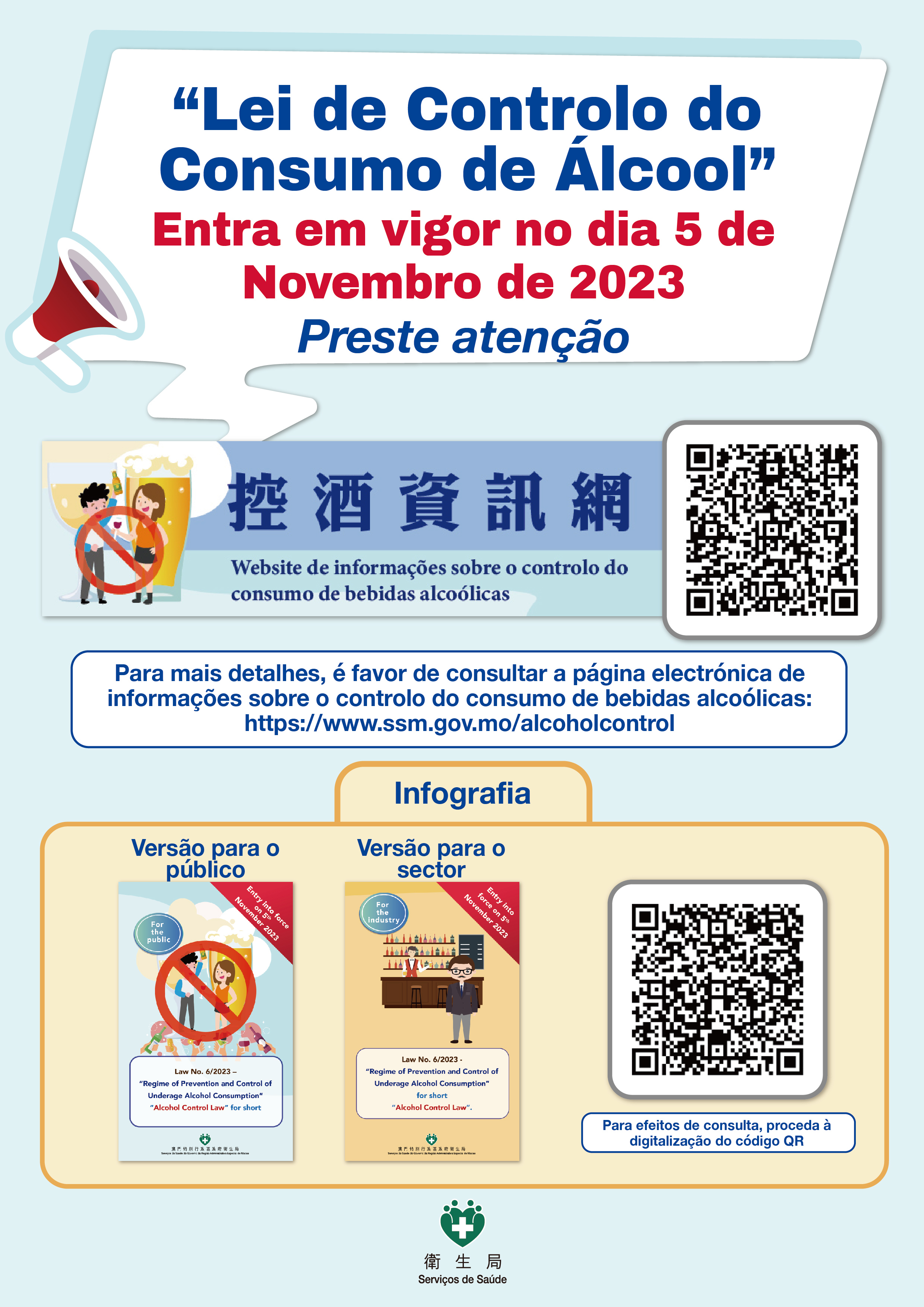 Estiveram presentes também na inauguração cerca de 180 representantes. Um representante dos Serviços de Saúde esclareceu detalhadamente aos presentes nesta actividade, o conteúdo da “Lei de Controlo do Consumo de Álcool”. Com o desenvolvimento contínuo dos trabalhos de divulgação sobre o controlo do álcool em Macau, os Serviços de Saúde, em conjunto com os membros da “Aliança para o Controlo do Consumo de Álcool de Macau”, vão continuar a desenvolver, de forma ordenada, os trabalhos de divulgação e de difusão jurídica, reforçando constantemente o conhecimento dos cidadãos e dos sectores relacionados sobre a nova lei. Em caso de dúvidas, podem recorrer às consultas através do telefone n.o 2855 6789 ou do e-mail: gpct@ssm.gov.mo. Além disso, com vista a reforçar os conhecimentos dos cidadãos e dos sectores sobre a “Lei do controlo de bebidas alcoólicas” e as informações sobre os malefícios das bebidas alcoólicas, os Serviços de Saúde criaram a página electrónica de Informação sobre o controlo do consumo das bebidas alcoólicas, na qual se encontram a respectiva legislação, infografia, orientações para os sectores e folhetos sobre os malefícios do álcool, entre outros. Para as informações, consulte a página electrónica: http://www.ssm.gov.mo/alcoholcontrol ou digitalizar o código QR em anexo.