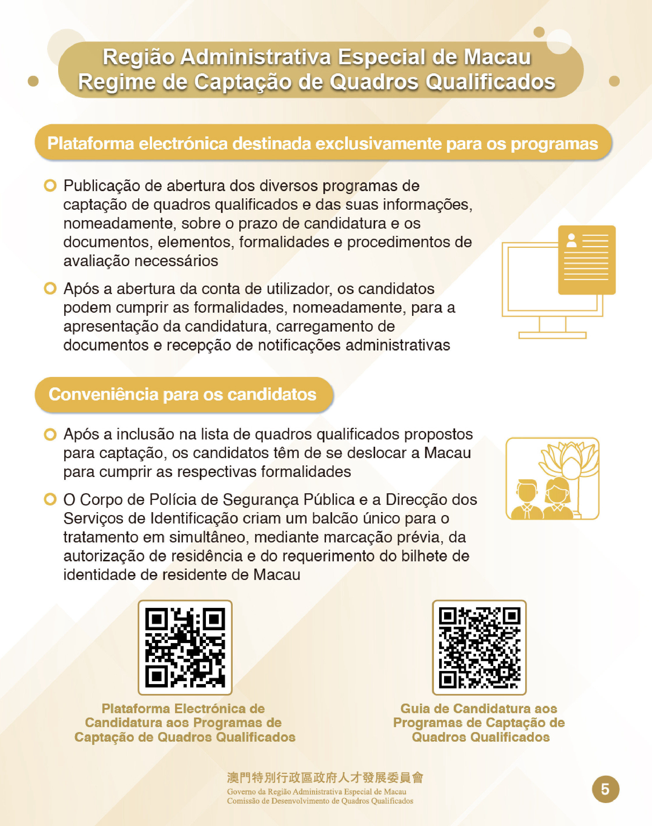 Na Plataforma Electrónica de Candidatura aos Programas de Captação de Quadros Qualificados, são publicados anúncios dos diversos programas de captação de quadros qualificados e o Guia de Candidatura aos Programas de Captação de Quadros Qualificados, onde estão disponíveis as informações, nomeadamente, sobre os documentos, elementos e procedimentos necessários para a candidatura e os critérios de avaliação aplicáveis. Após a abertura da conta de utilizador na plataforma electrónica, os candidatos podem cumprir as formalidades, nomeadamente, para a apresentação da candidatura, carregamento de documentos e recepção de notificações administrativas.