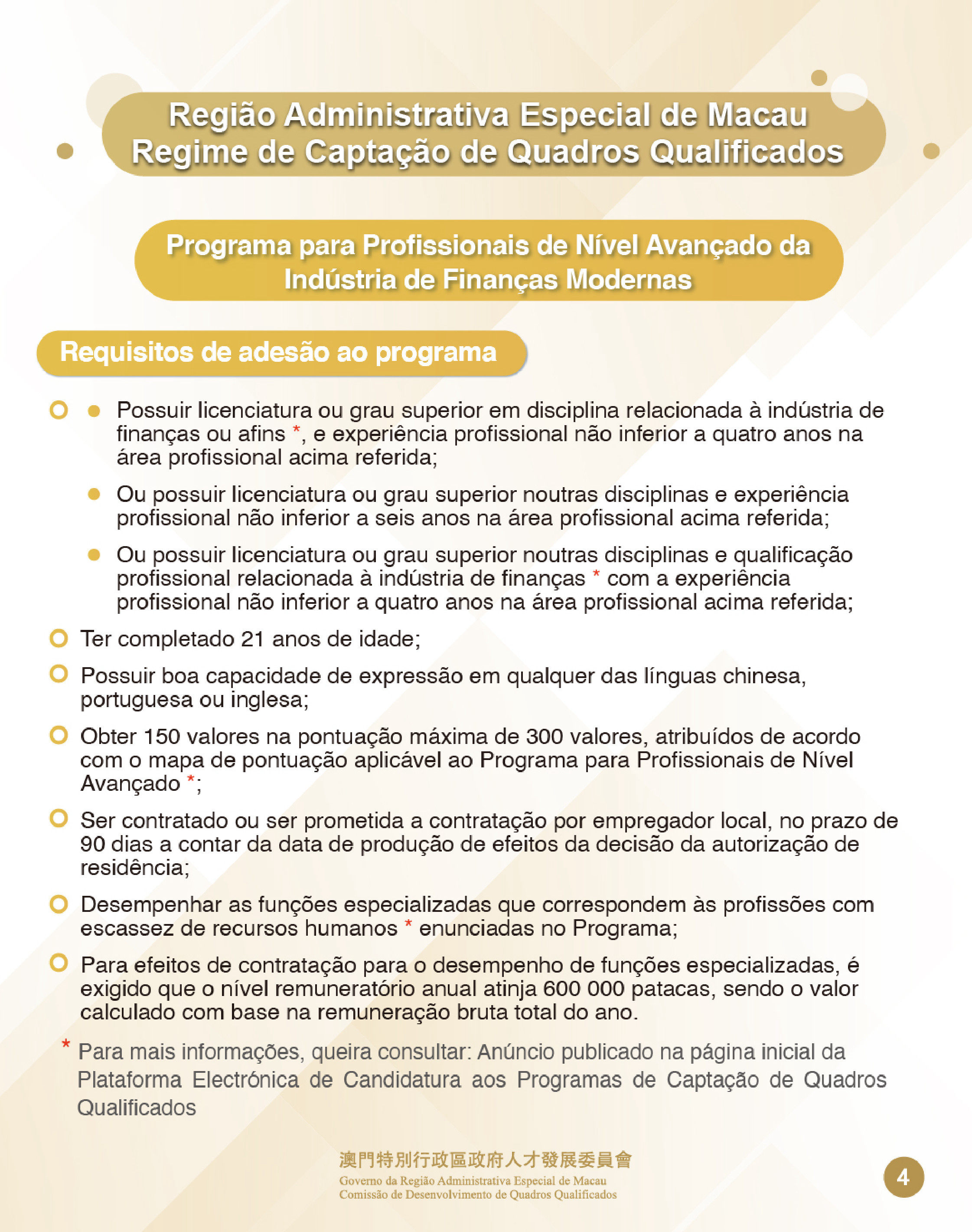 De 6 de Outubro de 2023 a 5 de Fevereiro de 2024, encontra-se aberto o período de candidaturas ao Programa para Profissionais de Nível Avançado da Indústria de Finanças Modernas, que visa captar indivíduos com experiência profissional e competência técnica que contribuam para o desenvolvimento da indústria de finanças modernas, nas seguintes áreas profissionais: 1) Desenvolvimento de actividades do mercado de títulos de dívida; 2) Desenvolvimento de actividades de gestão de fortunas; 3) Desenvolvimento de actividades de finanças sustentáveis; 4) Desenvolvimento de actividades de bancos comerciais; 5) Desenvolvimento de actividades seguradoras; 6) Desenvolvimento de aplicações de tecnologia financeira; 7) Investigação financeira. Os candidatos têm de preencher, cumulativamente, os seguintes requisitos: possuir licenciatura ou grau superior em disciplina relacionada à indústria de finanças ou afins, e experiência profissional não inferior a quatro anos na área profissional acima referida; ou possuir licenciatura ou grau superior noutras disciplinas e experiência profissional não inferior a seis anos na área profissional acima referida; ou possuir licenciatura ou grau superior noutras disciplinas e qualificação profissional relacionada à indústria de finanças com a experiência profissional não inferior a quatro anos na área profissional acima referida; ter completado 21 anos de idade; possuir boa capacidade de expressão em qualquer das línguas chinesa, portuguesa ou inglesa; obter 150 valores na pontuação máxima de 300 valores, atribuídos de acordo com o mapa de pontuação aplicável ao programa; ser contratado ou ser prometida a contratação por empregador local, no prazo de 90 dias a contar da data de produção de efeitos da decisão da autorização de residência, para o desempenho de funções especializadas que correspondem às profissões com escassez de recursos humanos enunciadas no programa, sendo exigido que, para o efeito, o nível remuneratório anual atinja 600 000 patacas, sendo o valor calculado com base na remuneração bruta total do ano, independentemente da sua designação, modo de pagamento ou forma de cálculo.