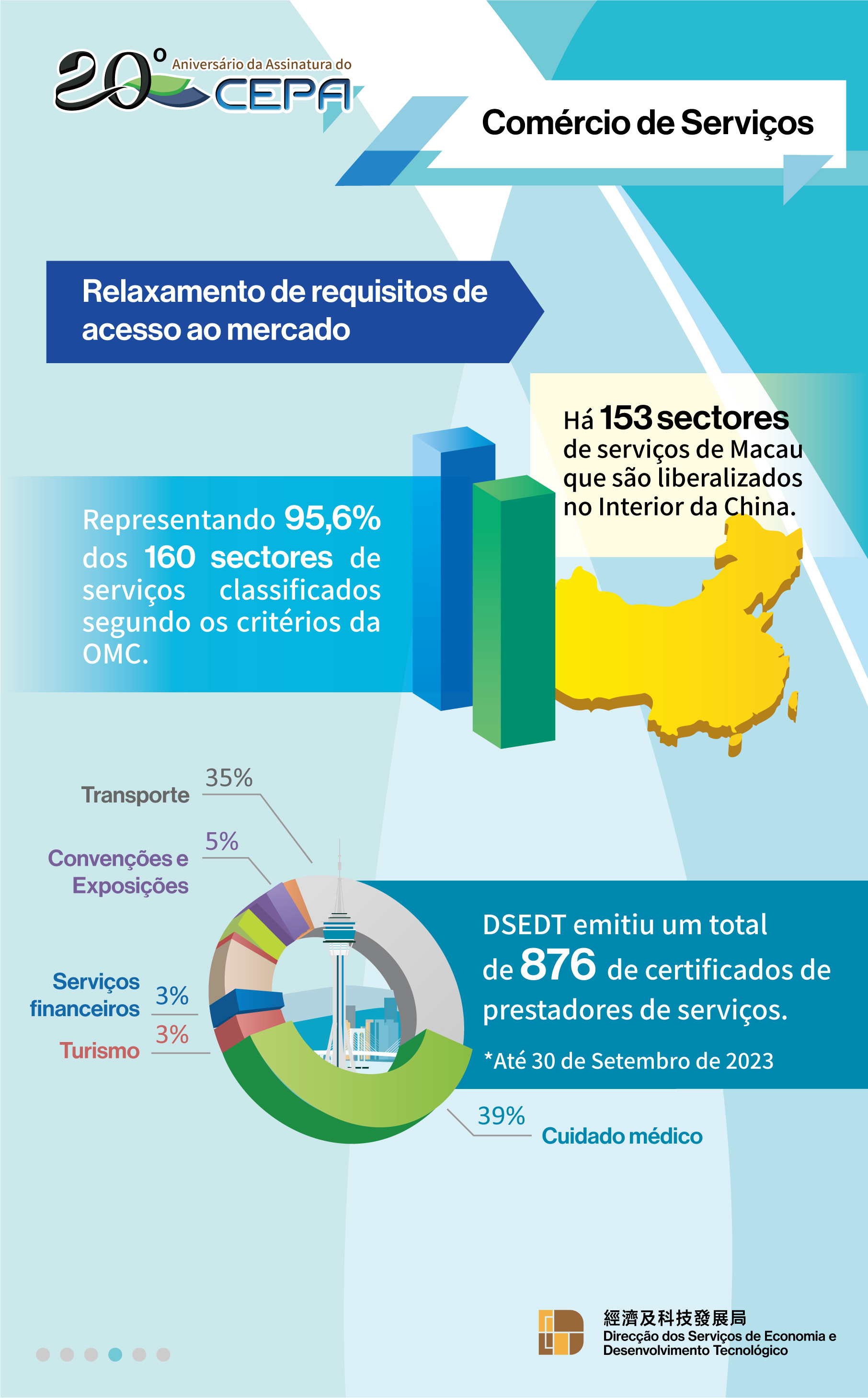 Em termos de comércio de serviços, a DSEDT emitiu até agora um total de 876 certificados de prestador de serviços de Macau do CEPA para ajudar as empresas de Macau a explorarem oportunidades de negócio no Interior da China. Através da política de liberalização do CEPA, especialmente das medidas preferenciais pioneiras das cidades da Grande Baía Guangdong-Hong Kong-Macau, as empresas e profissionais de diversos sectores de serviços de Macau, tais como serviços financeiros, cuidado médico, jurídicos, fiscais, construção e engenharia, turismo e serviços sociais, aproveitaram a oportunidade de uma maior liberalização concedida pelo Interior da China aos sectores de serviços de Macau e expandiram com sucesso os seus negócios no Interior da China.