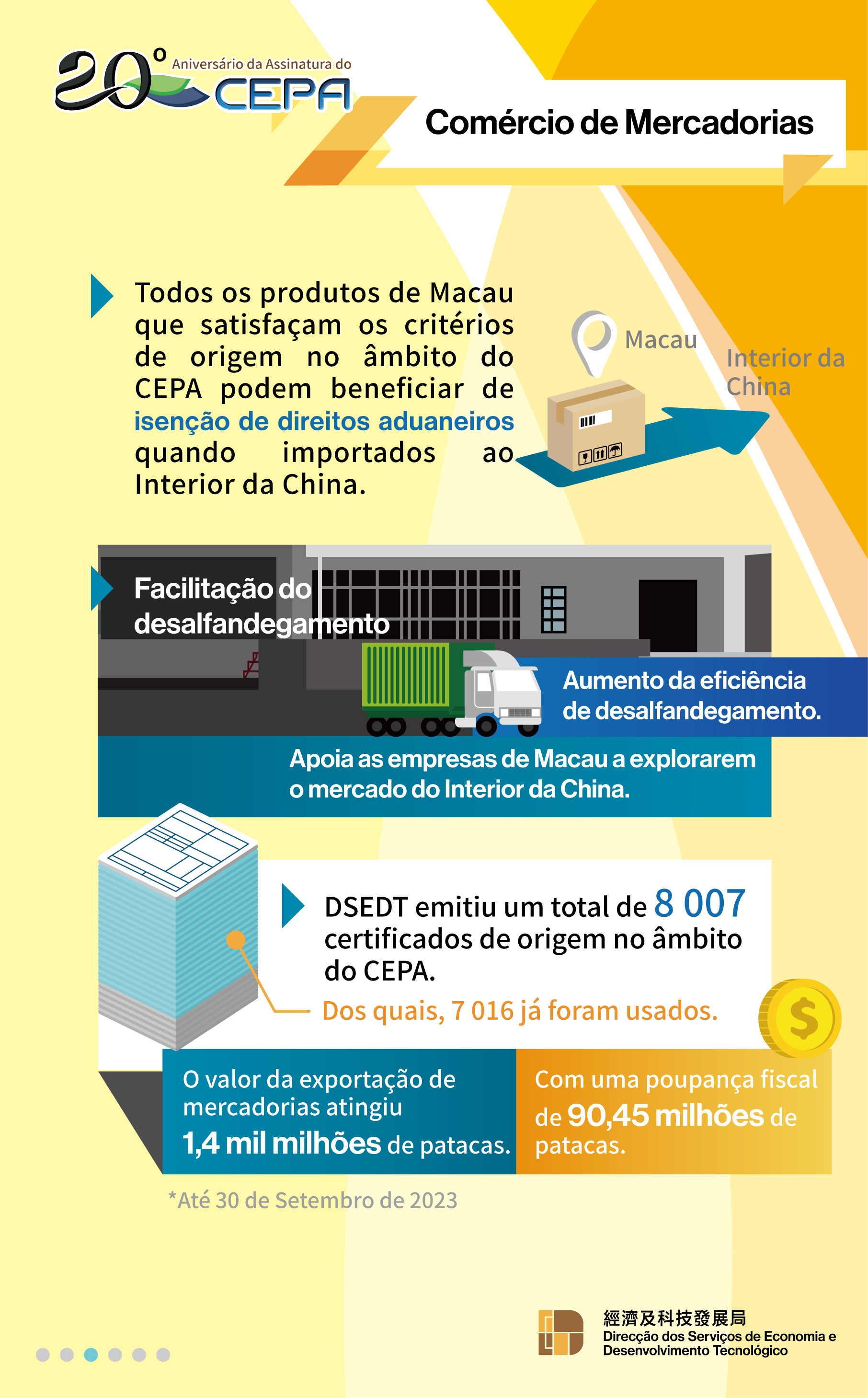 No que diz respeito ao comércio de mercadorias, todos os produtos de Macau exportados para o Interior da China, desde que satisfaçam os critérios de origem do CEPA, podem beneficiar da isenção dos direitos aduaneiros. Desde a implementação do CEPA até Setembro deste ano, o valor das exportações de mercadorias das empresas de Macau para o Interior da China através da política de isenção dos direitos aduaneiros do CEPA atingiu 1,4 mil milhões de patacas, tendo poupando para as empresas de Macau, acumulativamente, mais de 90 milhões de patacas em termos dos direitos aduaneiros.