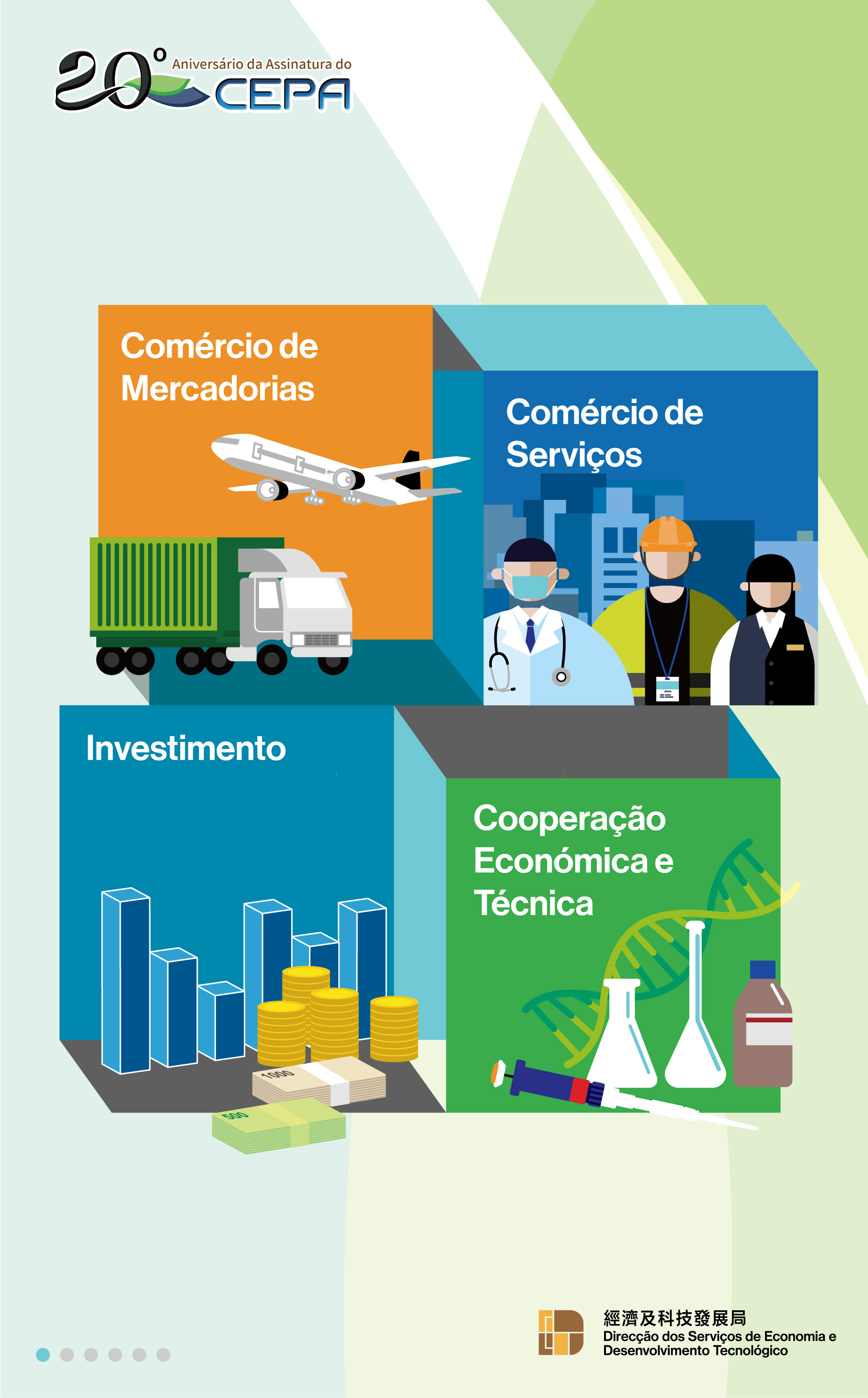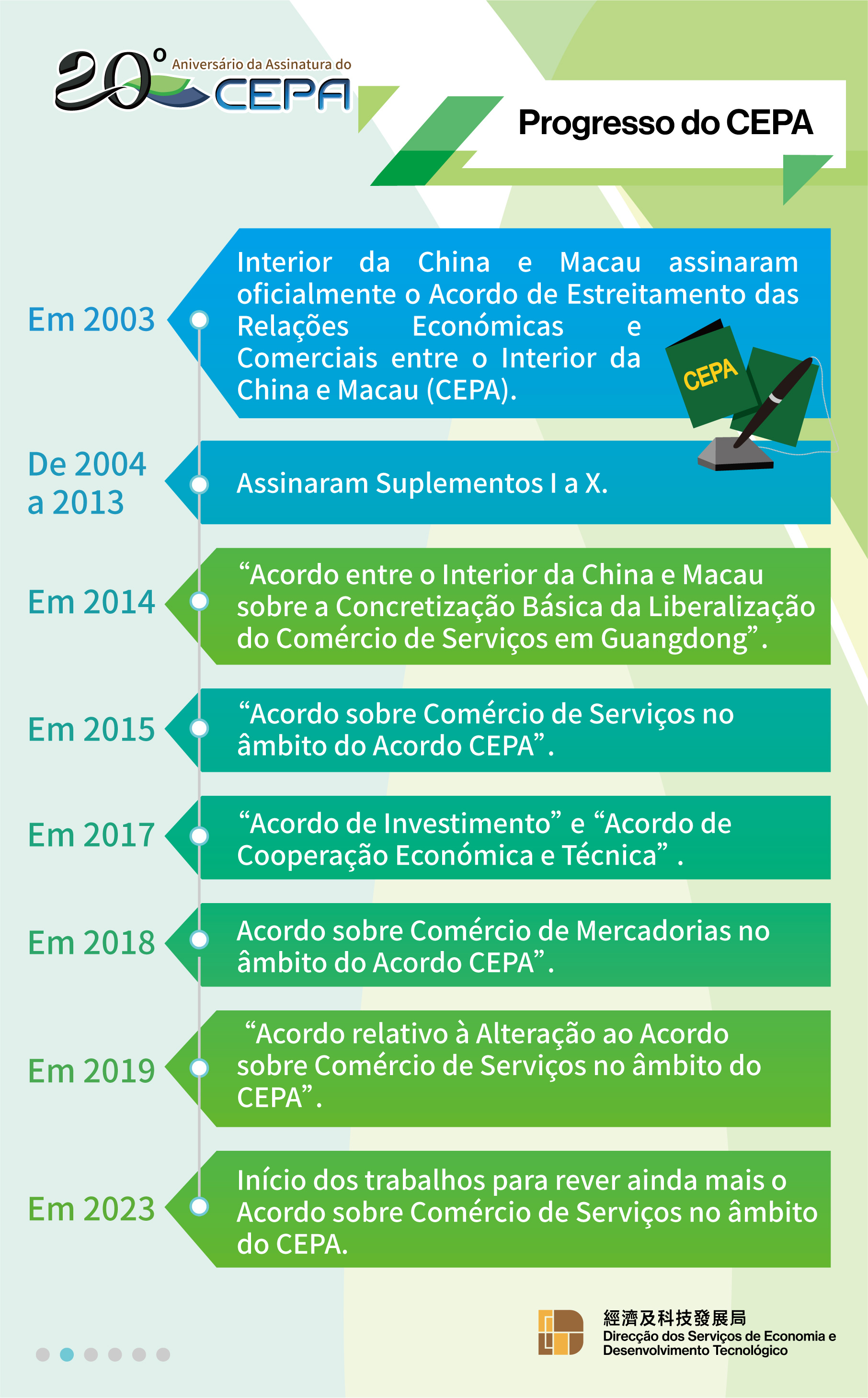 Para celebrar o 20.º aniversário da assinatura do CEPA, que é um marco miliário importante, a Direcção dos Serviços de Economia e Desenvolvimento Tecnológico (DSEDT) lançou uma série de actividades publicitárias, incluindo, nomeadamente, a organização da exposição fotográfica em comemoração do 20.º aniversário da assinatura do CEPA, a elaboração de vídeos promocionais e infografias, de modo a fazer uma retrospectiva, junto com todos os sectores da sociedade, o percurso do desenvolvimento e os êxitos obtidos do CEPA durante as últimas duas décadas. Espera-se que o CEPA traga mais oportunidades de desenvolvimento para o sector empresarial no futuro, promovendo o desenvolvimento diversificado da economia de Macau.