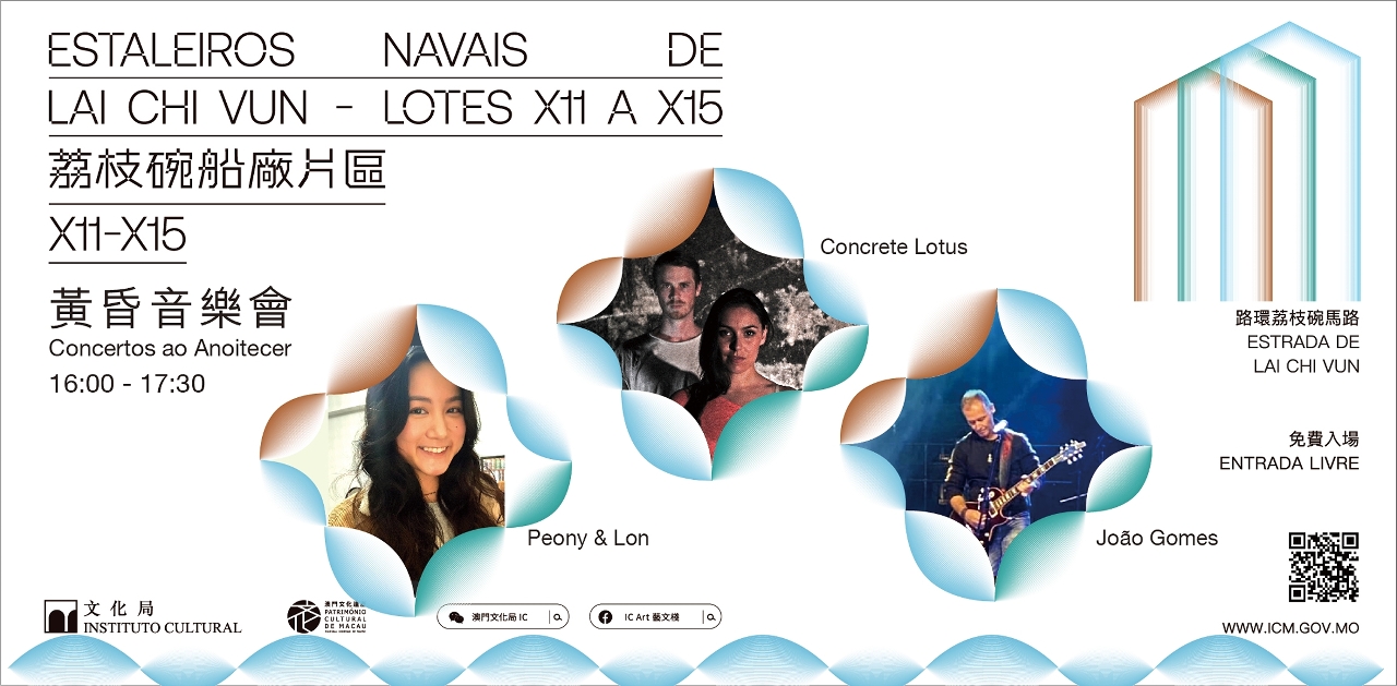 O espaço expositivo dos Estaleiros Navais de Lai Chi Vun - Lotes X11 encontra-se aberto diariamente, das 10:00 às 18:00 horas. Os Estaleiros Navais de Lai Chi Vun - Lotes X12 a X15 estão abertos diariamente, durante todo o dia. Devido à programação, o “Ponto de Busking” na zona dos estaleiros será encerrado nos dias da realização do Concerto ao Anoitecer. Para mais informações sobre os Estaleiros Navais de Lai Chi Vun, é favor consultar a página electrónica do IC ( www.icm.gov.mo ), a conta oficial do Instituto Cultural “IC_Art_Macao” no WeChat, a página “IC_Art” no Facebook e a conta do IC no Xiaohongshu (ENJOY MACAO).