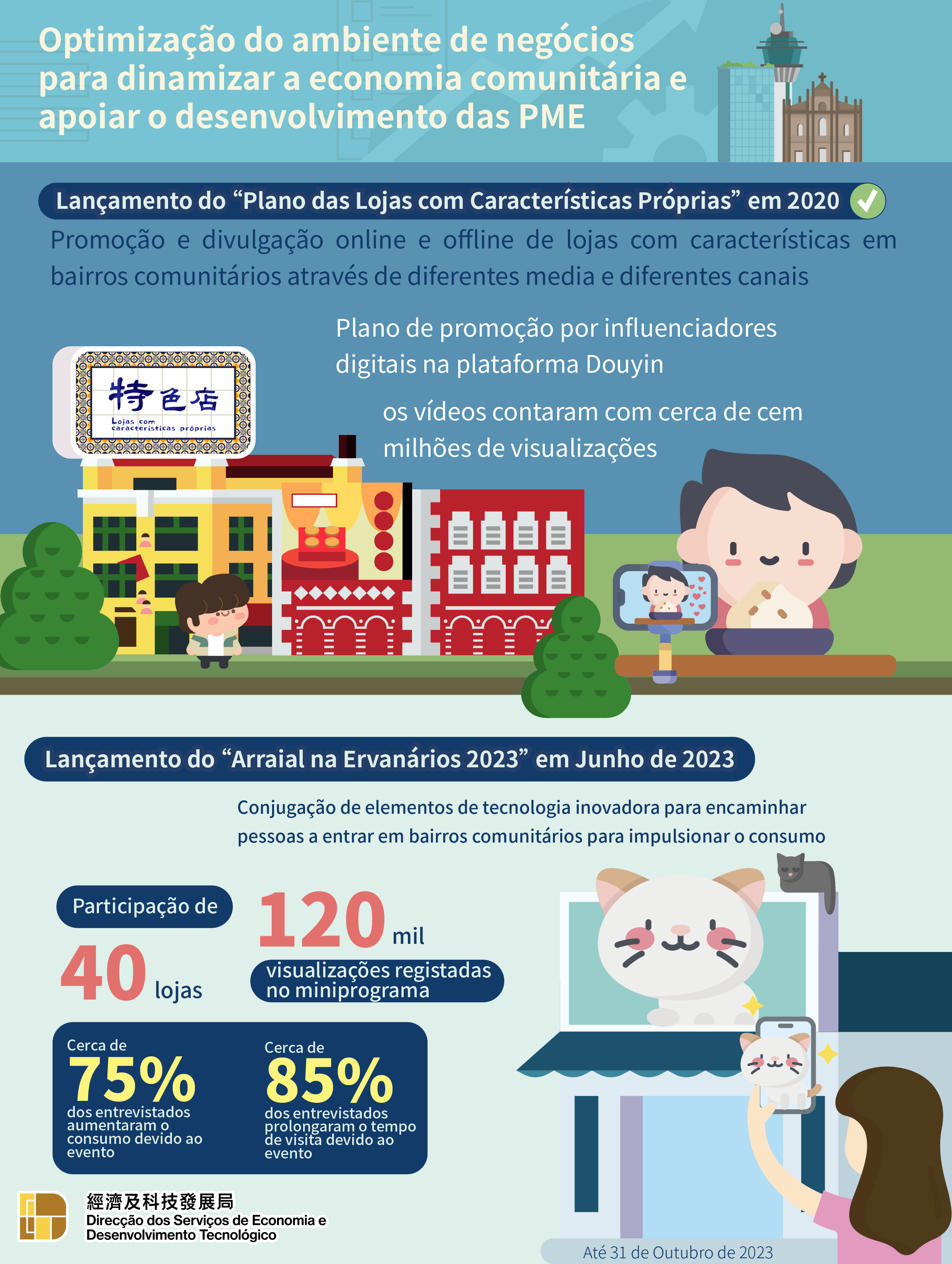Para continuar a optimizar o ambiente de negócios e revitalizar a economia comunitária, o Governo da RAEM adoptou medidas de diversas vertentes para ajudar as empresas de Macau a elevar a eficiência de gestão e a competitividade, incluindo o recurso à tecnologia inovadora para mostrar o encanto característico da comunidade e o reforço da divulgação e promoção online e offline, de modo a encaminhar pessoas a consumirem em bairros comunitários.