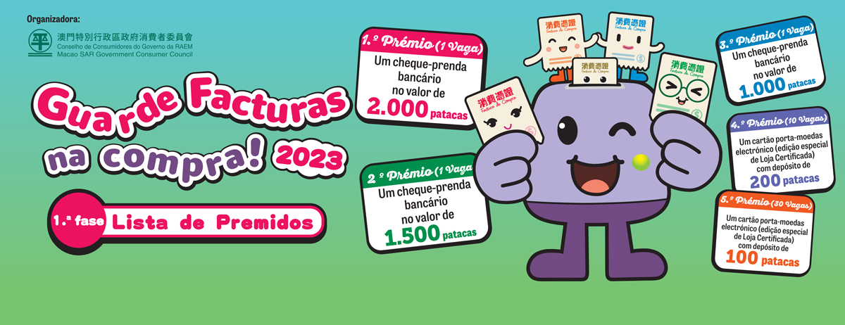 Na 1.ª fase da actividade “Guarde Facturas na compra! 2023”, foram sorteados no total 43 premiados, sendo a respectiva lista já disponsabilizada na página electrónica do CC (www.consumer.gov.mo) e afixada no quadro de aviso do escritório do CC (Av. de Horta e Costa, n.º 26, Edifício Clementina A.L. Ho, R/C). Em relação ao levantamento de prémios, os premiados serão informados pelo CC através da SMS.