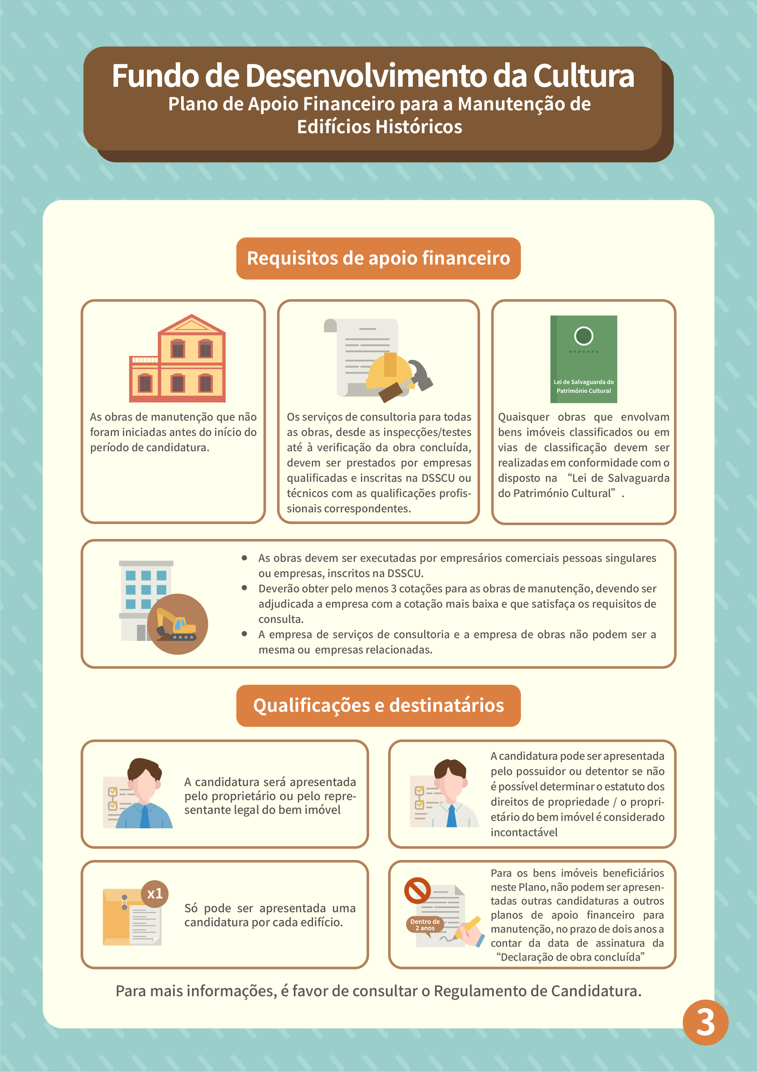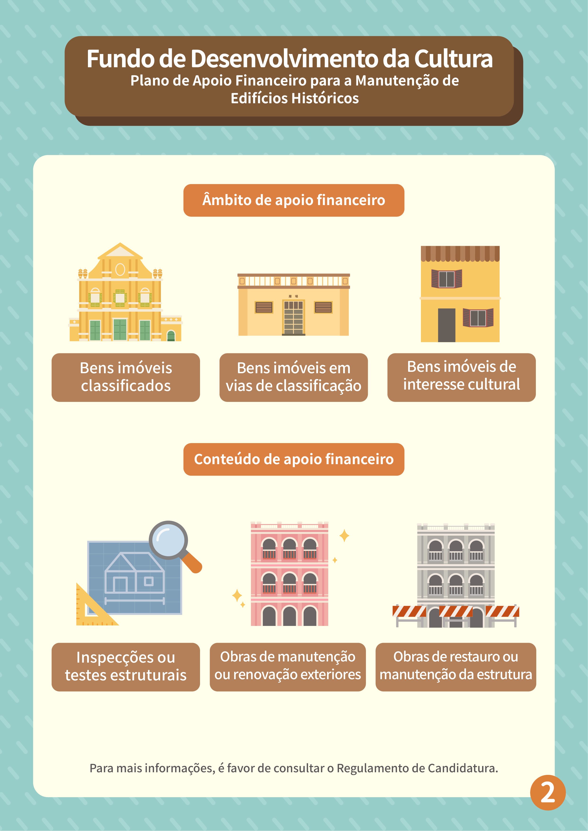 Para melhor promover a salvaguarda e a revitalização dos edifícios históricos, o Fundo de Desenvolvimento da Cultura (FDC) lança o “Plano de apoio financeiro para a manutenção de edifícios históricos”, de modo a aumentar a motivação dos proprietários de realizarem a manutenção regular por iniciativa própria e reforçar a salvaguarda dos edifícios patrimoniais privados e de interesse cultural.