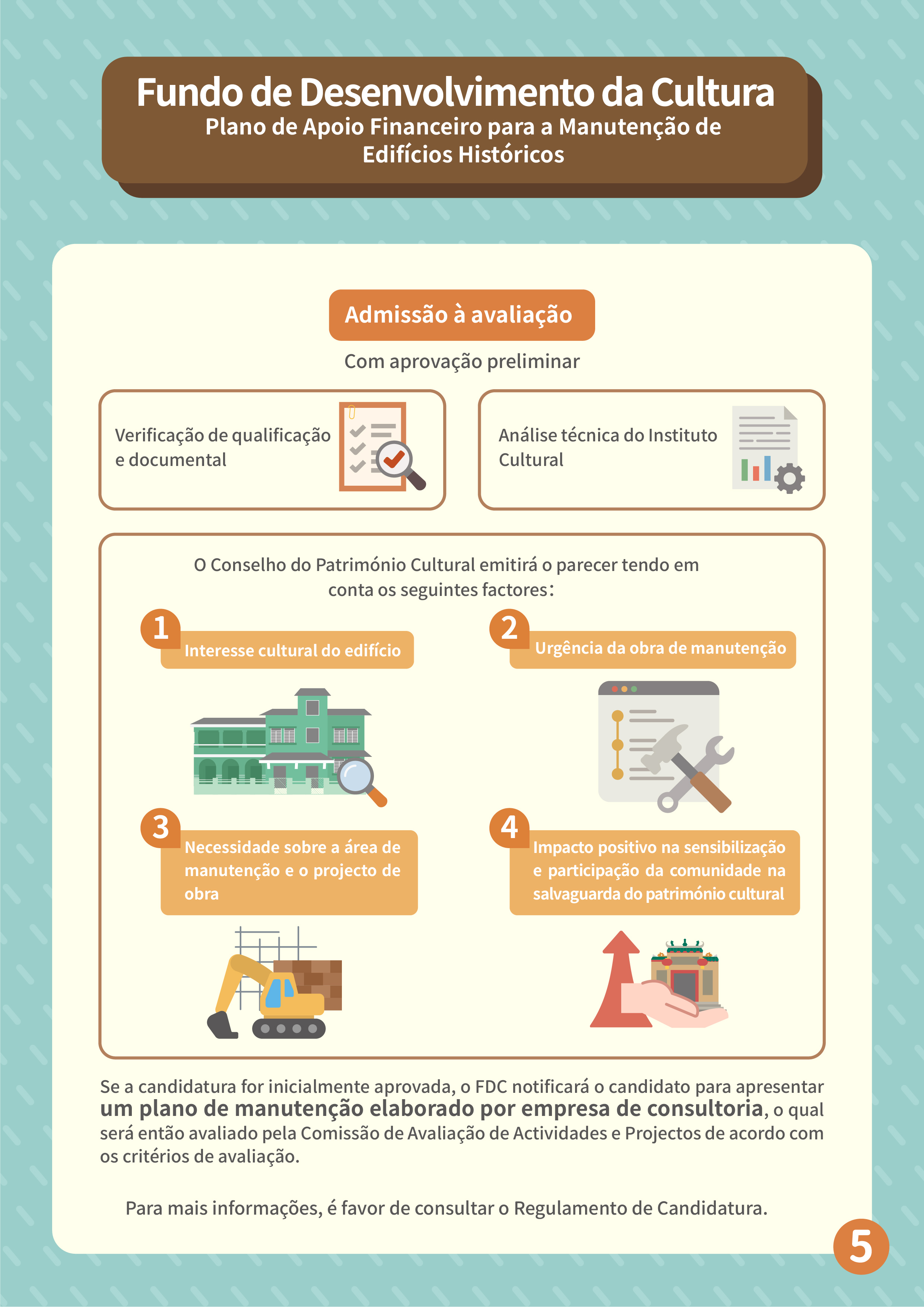 O Plano visa apoiar os proprietários a realizarem inspecções ou testes estruturais regulares, a manutenção externa dos edifícios patrimoniais privados e de interesse cultural, bem como, o restauro e a manutenção necessários de acordo com os resultados dos testes. O FDC procederá à verificação de qualificações e documental a projectos candidatos e depois enviará os mesmos ao Instituto Cultural para análise técnica, seguindo-se o parecer emitido pelo Conselho do Património Cultural tendo em conta os diversos factores, tais como, o interesse cultural do edifício candidato, a urgência e necessidade da obra de manutenção, o impacto positivo na sensibilização e na salvaguarda do património cultural. Se a candidatura for aprovada preliminarmente, o FDC notificará o candidato para apresentar um plano de manutenção elaborado por empresa dos serviços de consultoria, o qual será então avaliado pela Comissão de Avaliação de Actividades e Projectos de acordo com os critérios de avaliação, nomeadamente, necessidade da obra de manutenção, eficácia do aperfeiçoamento previsto do estado do edifício e razoabilidade do orçamento. Serão atribuídas pontuações adicionais se o projecto candidato tiver um plano de abertura ao público ou plano de revitalização após a manutenção.