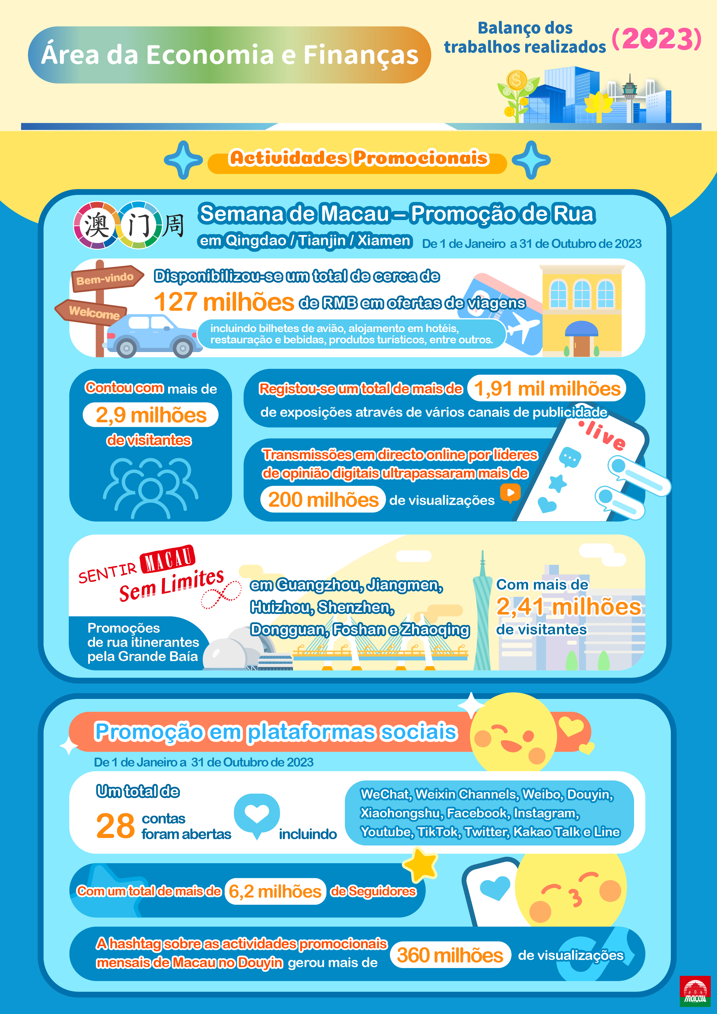 A Direcção dos Serviços de Turismo (DST) continua a aprofundar a integração intersectorial do “turismo +” e a enriquecer os elementos turísticos. Em simultâneo, tem realizado activamente promoções online e presenciais, conjugadas com os grandes eventos de cada mês, e cooperado com os operadores turísticos para expandir as fontes de visitantes, tendo obtido resultados notáveis até à data.