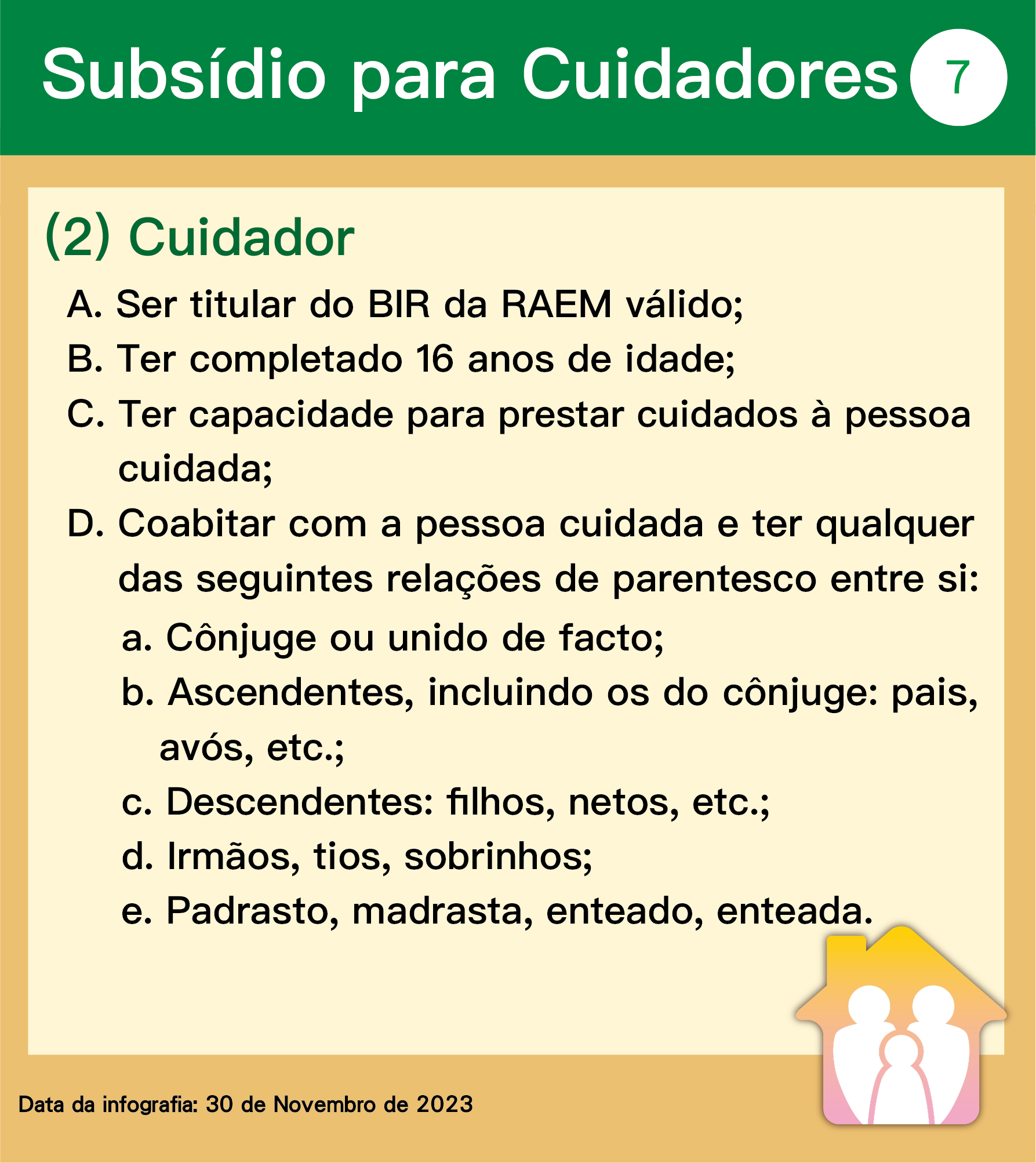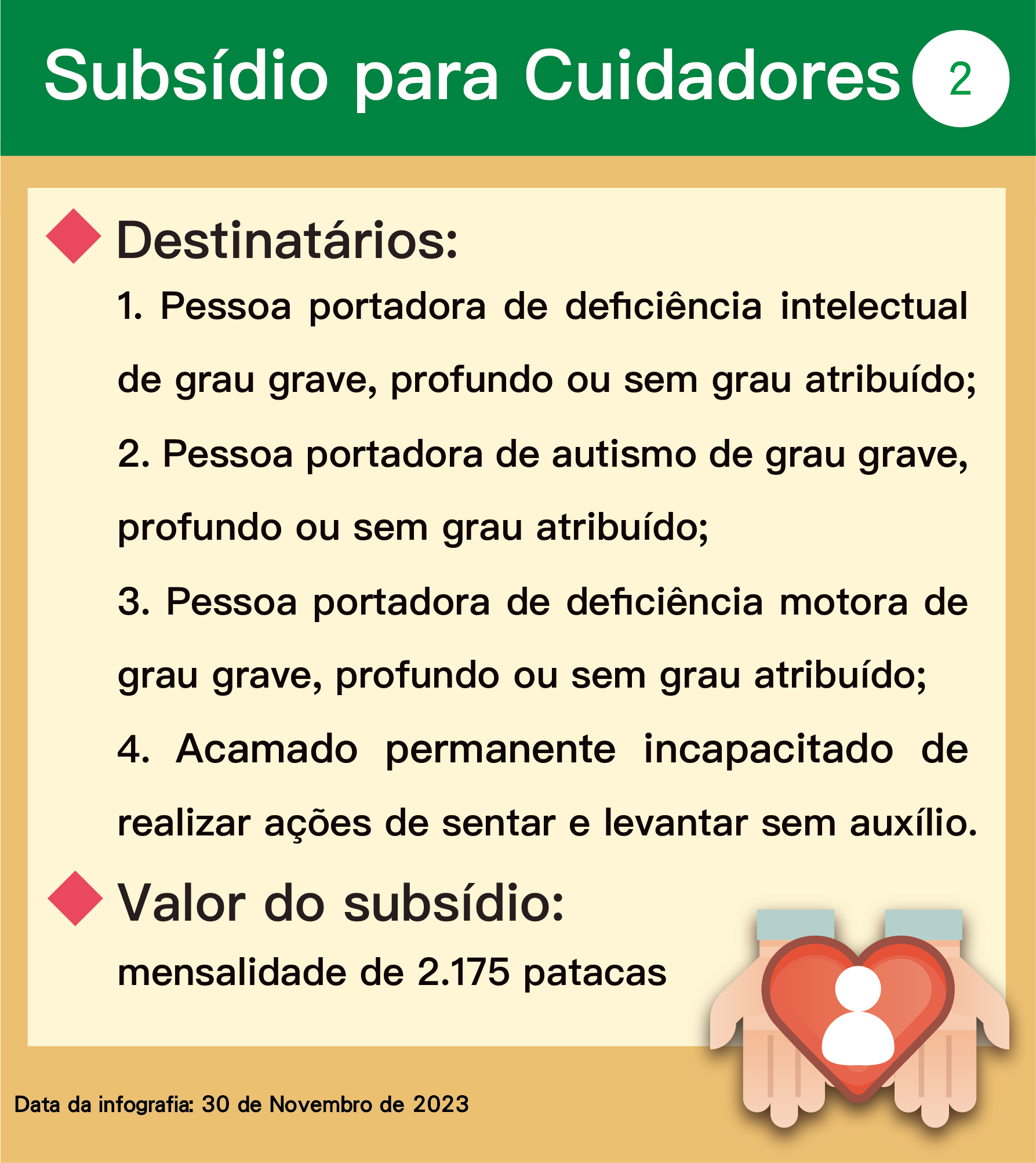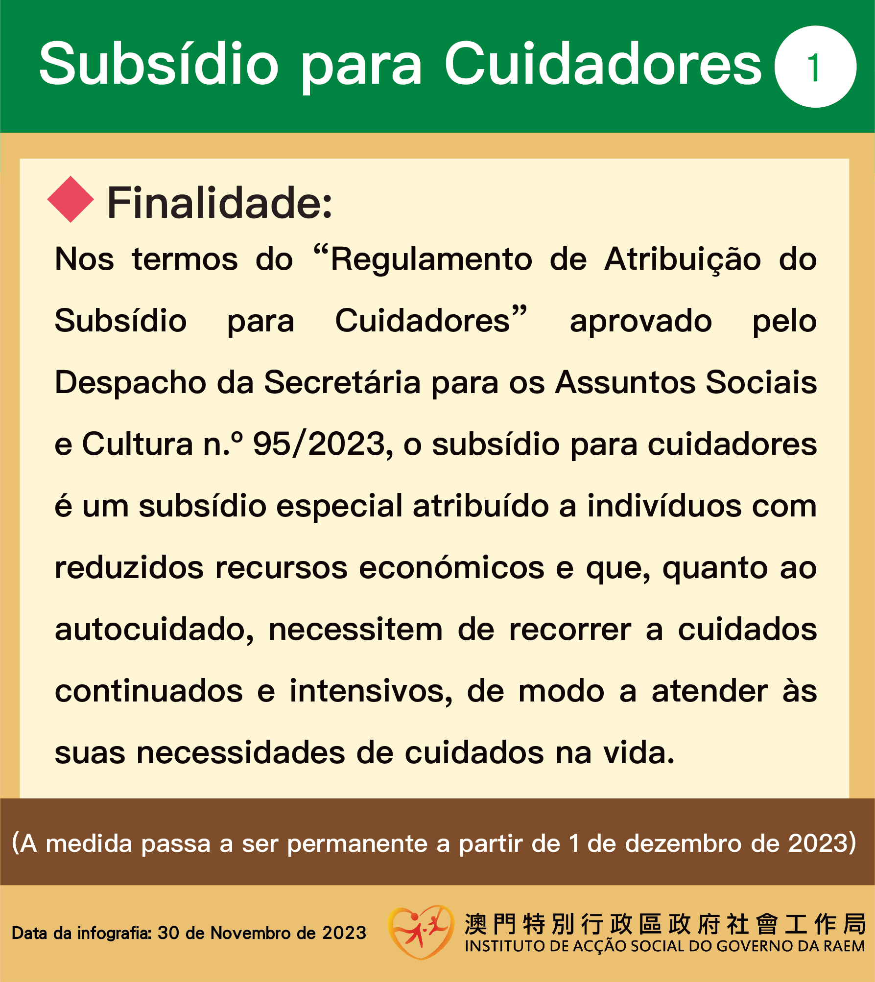 O “Regulamento de Atribuição do Subsídio para Cuidadores” (adiante designado por Regulamento) aprovado pelo Despacho da Secretária para os Assuntos Sociais e Cultura n.º 95/2023, entra em vigor no dia 1 de Dezembro. Nesta conformidade, o Subsídio para Cuidadores passa a ser, oficialmente, uma medida permanente. O Regulamento define o regime de atribuição e a disponibilização do respectivo subsídio e o Instituto de Acção Social (IAS) irá, de acordo com o estipulado no Regulamento, acompanhar os trabalhos relativos ao pedido, à aprovação, à atribuição, à fiscalização, à revisão, etc.