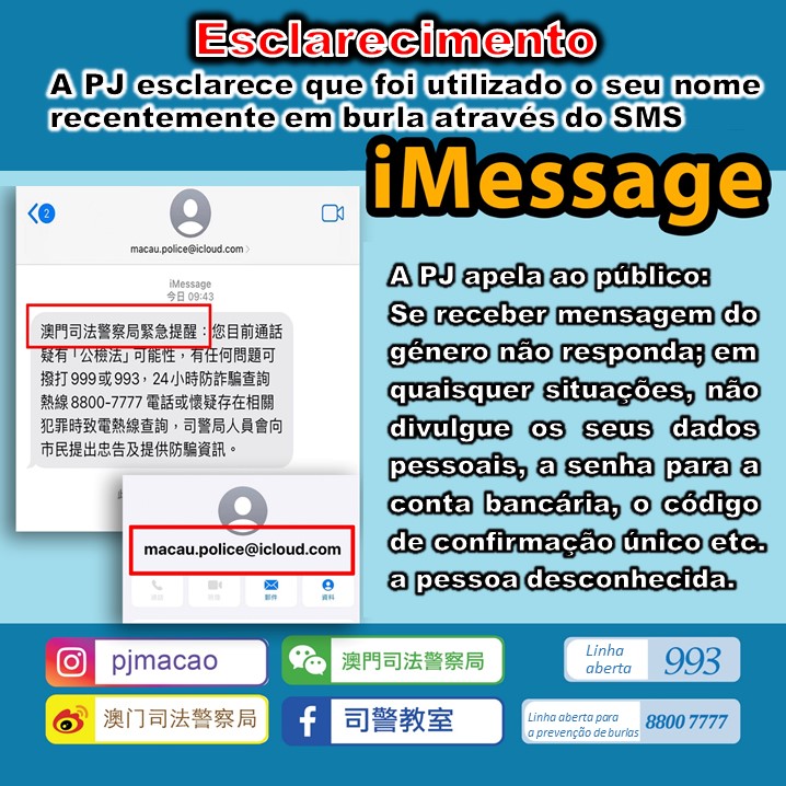 A PJ foi hoje contactada por vários cidadãos que disseram terem recebido um telefonema fraudulento do tipo de “fingir pessoal da segurança pública da China continental, após o qual receberam um iMessage enviado pela “Polícia Judiciária” para os seus telemóveis, com alerta a prevenir a burla telefónica. O emissor desta messagem foi “macau.police@icloud.com”.