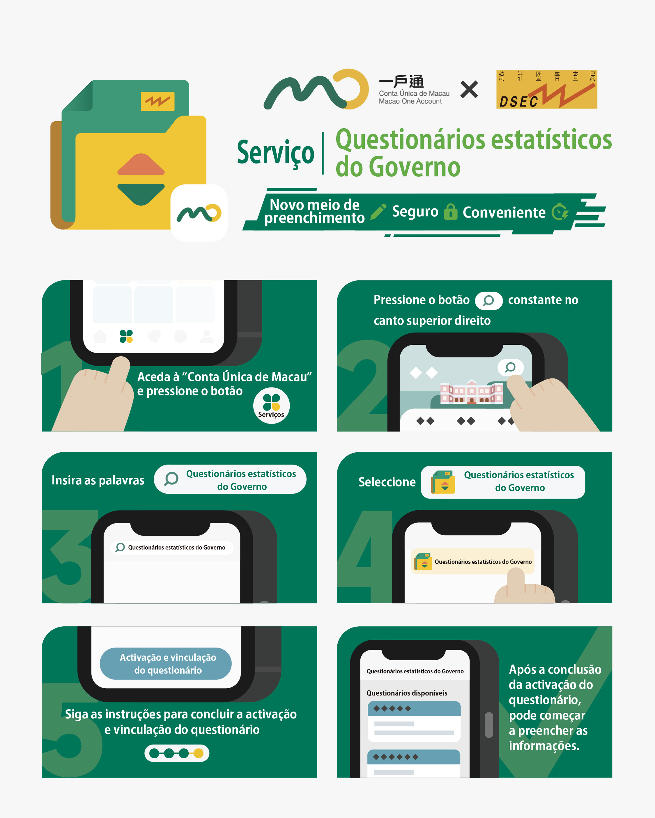 A DSEC continua a adicionar e a optimizar diversos serviços electrónicos, ampliando gradualmente as funções destes serviços e empenhando-se na prestação de serviços estatísticos de melhor qualidade aos residentes. Para mais informações, queira aceder à página electrónica da DSEC ( https://www.dsec.gov.mo/pt-PT/Service/Respondent ), a fim de consultar a infografia promocional do serviço “Questionários estatísticos do Governo”.
