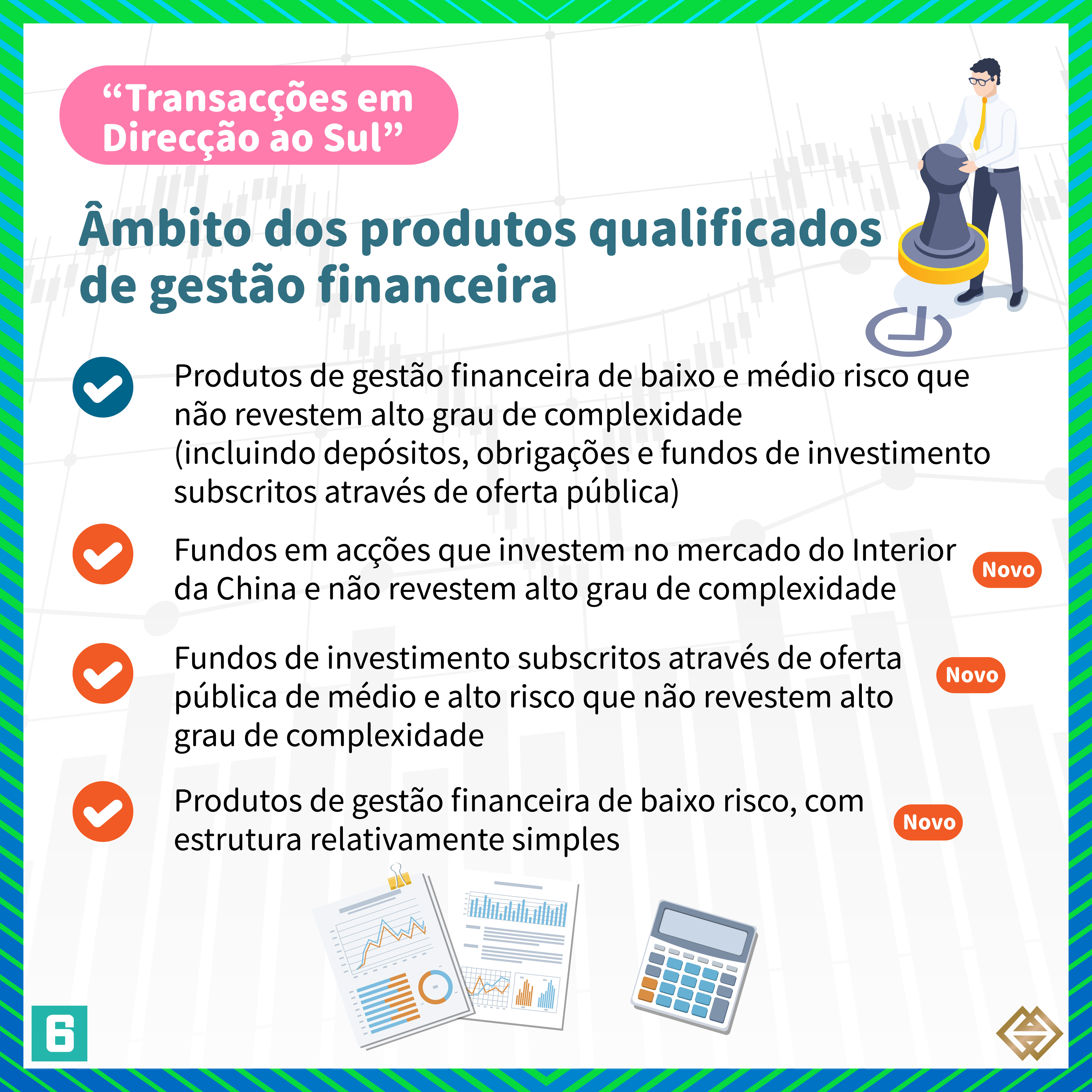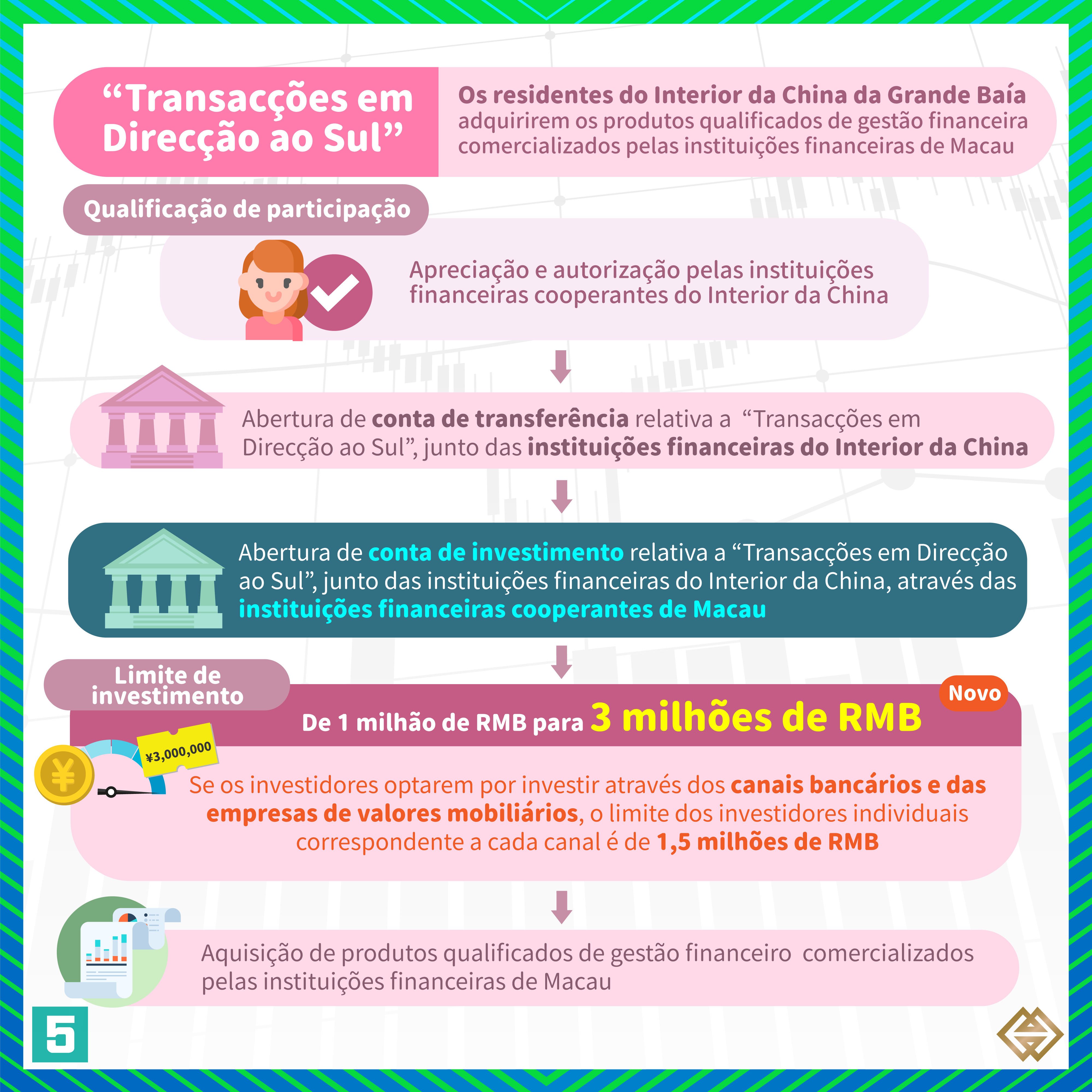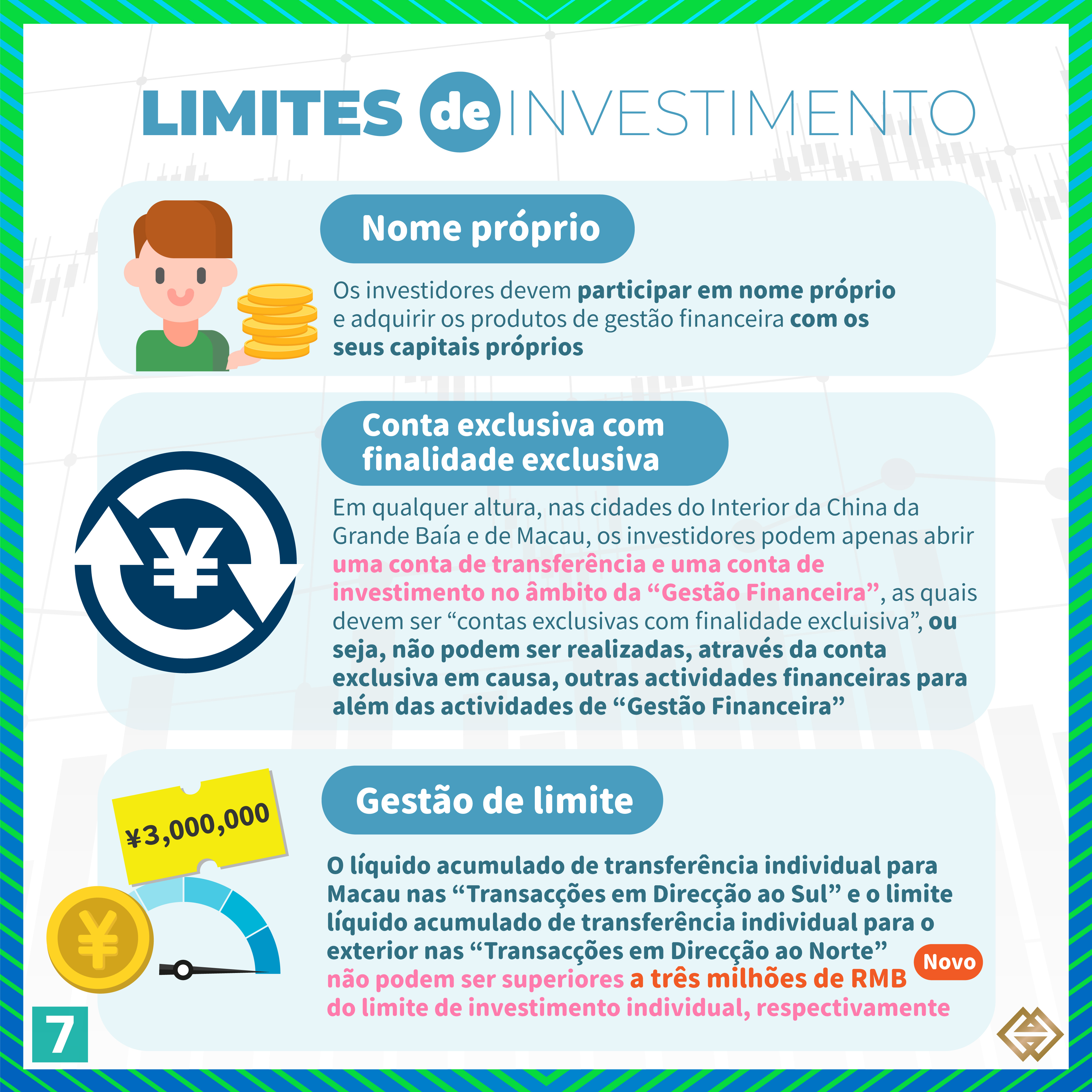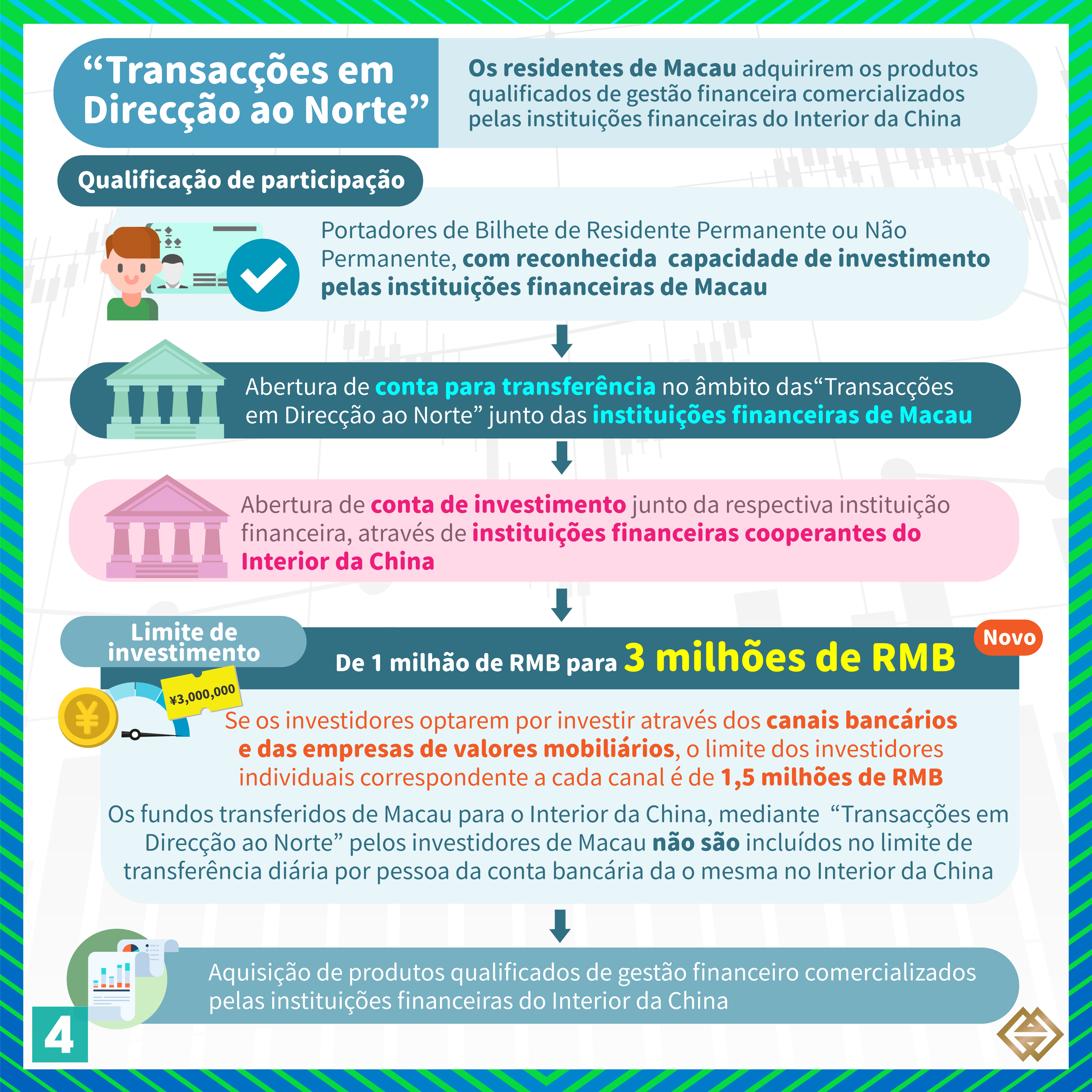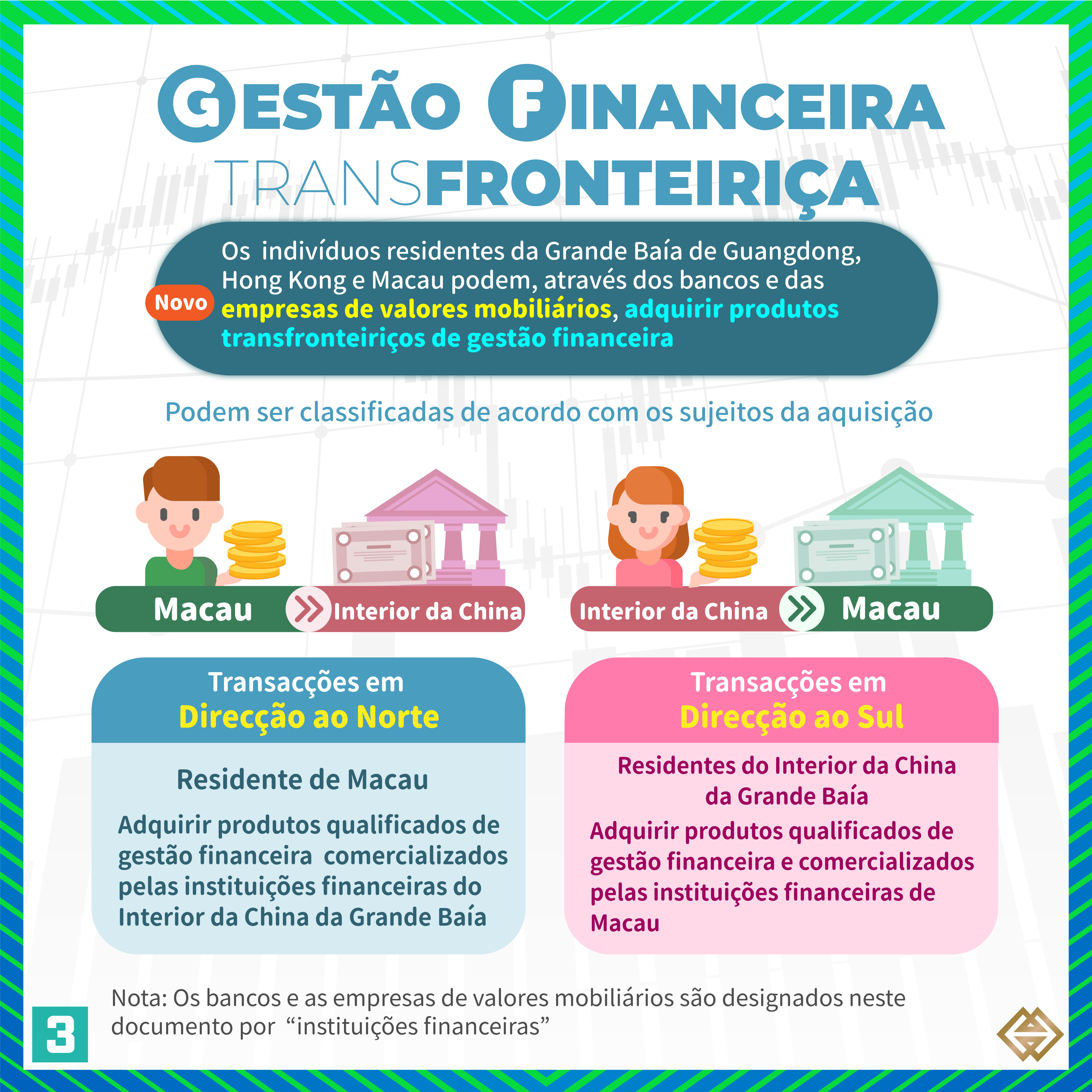 De acordo com a nova Regulamentação publicada pela AMCM, para além dos bancos de Macau autorizados a exercer a actividade de “Gestão Financeira Transfronteiriça”, as instituições financeiras licenciadas em Macau para prestar serviços relacionados com valores mobiliários (“empresas de valores mobiliários”) podem também exercer actividades de “Gestão Financeira Transfronteiriça”, em conformidade com as disposições da Regulamentação  (para mais informações, consultar a lista de instituições participantes em https://www.amcm.gov.mo/zh-hant/news-notice/cross-border-financial-management/cross-border-financial-management-participating-agencies). Além disso, os investidores podem adquirir uma gama mais alargada de produtos qualificados de gestão financeira e o limite das operações dos investidores individuais foi aumentado de 1 milhão de RMB para 3 milhões de RMB. Se os investidores optarem por investir através dos canais bancários e das empresas de valores mobiliários, o limite dos investidores individuais correspondente a cada canal é de 1,5 milhões de RMB.