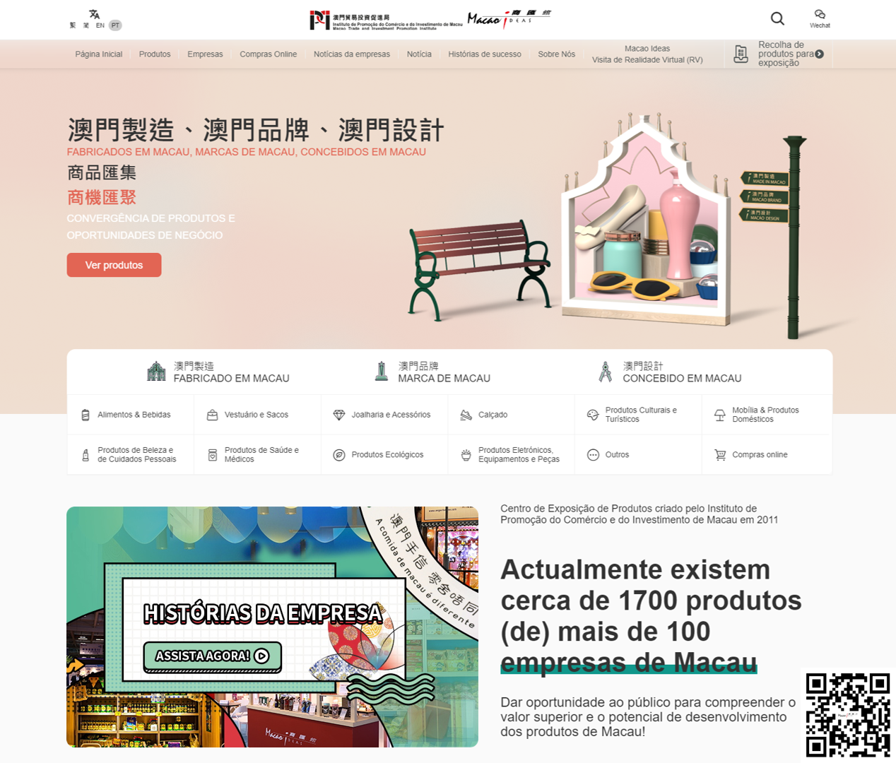 Foi completamente actualizada a página electrónica do Macao Ideas do Instituto de Promoção do Comércio e do Investimento de Macau (https://macaoideas.ipim.gov.mo/), que reúne mais de 100 empresas locais e cerca de 1.700 produtos “fabricados em Macau”, de “marcas de Macau” e “concebidos em Macau”. Com base no conteúdo multimédia, acrescentaram-se principalmente: a exibição online de realidade virtual (RV), a pesquisa optimizada por palavras-chave, a função de partilha com um clique para plataformas de redes sociais, entre outros. Deste modo, ajuda-se os comerciantes nacionais e internacionais a conhecer os produtos de boa qualidade de Macau num sítio único e de uma forma conveniente, poupando tempo.