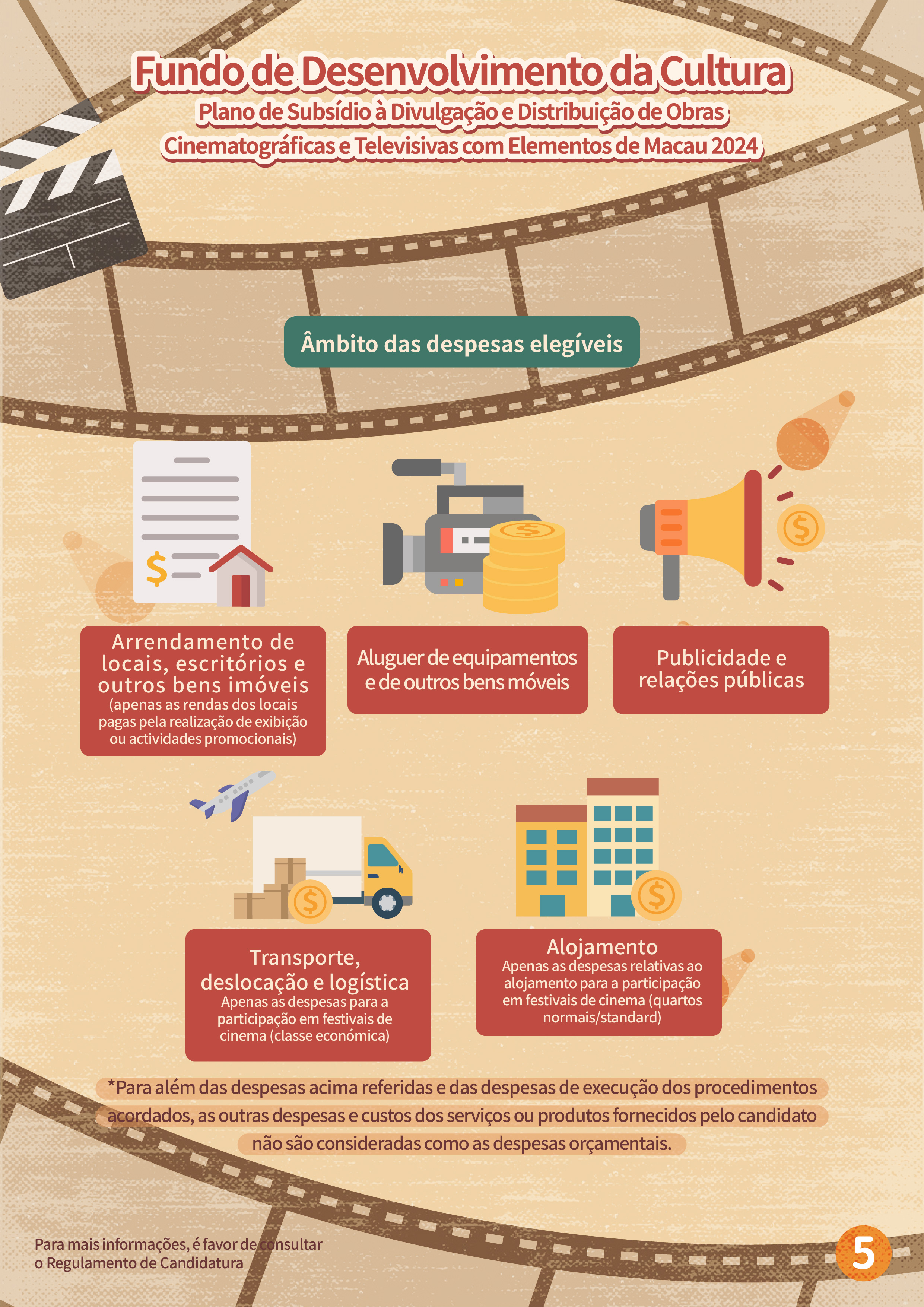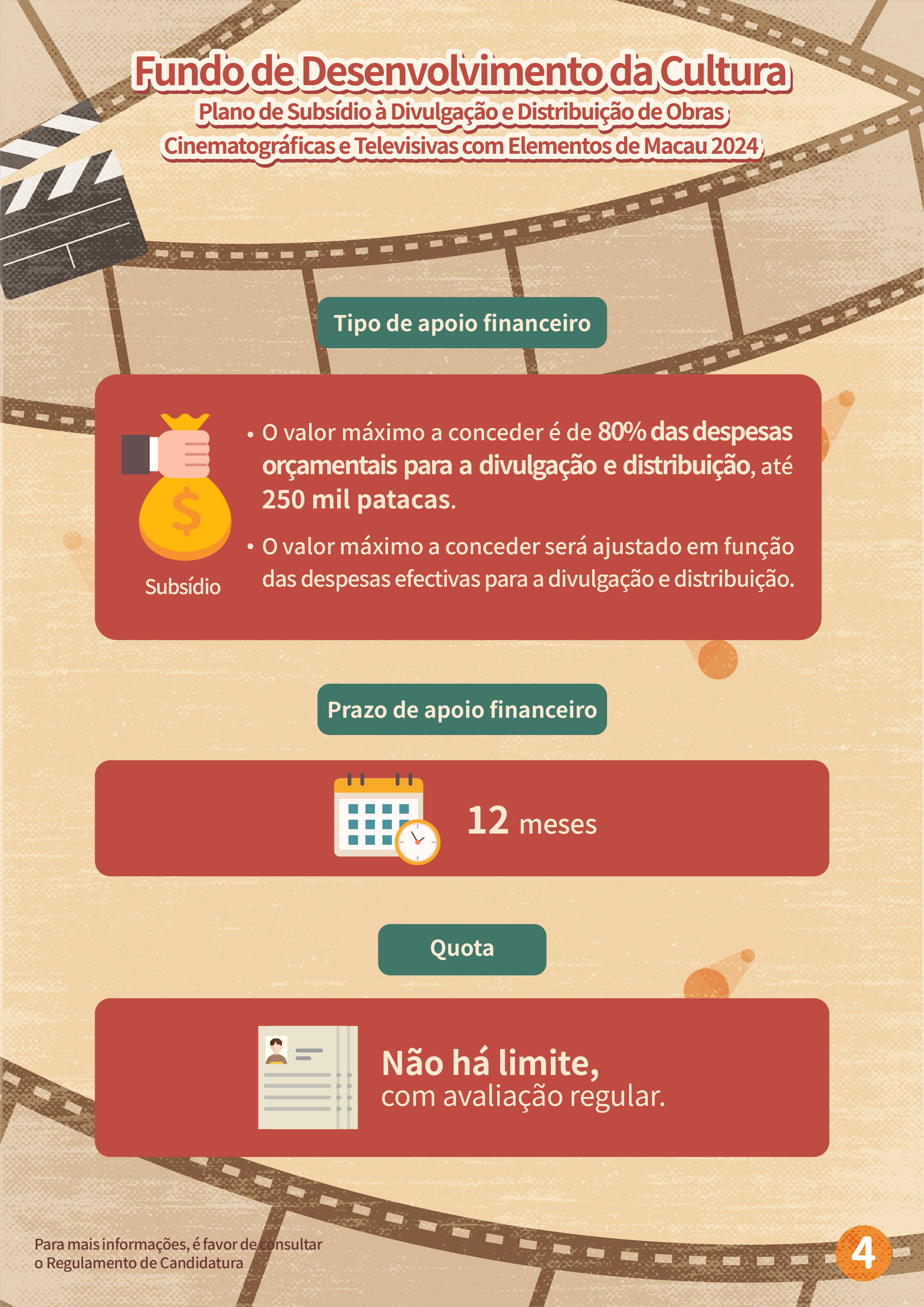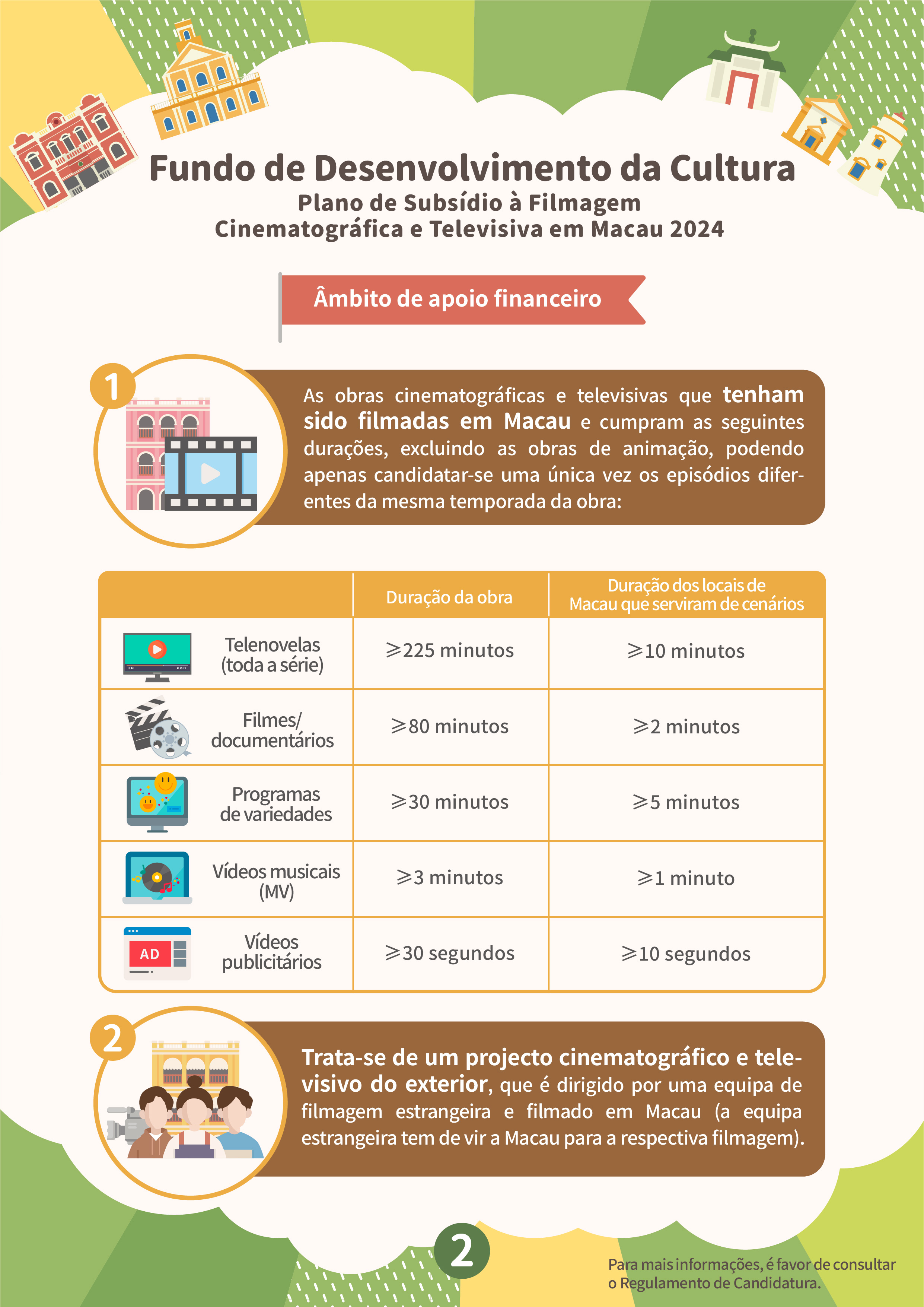 O “Plano de subsídio à filmagem cinematográfica e televisiva em Macau” tem por objectivo atrair equipas estrangeiras para a filmagem em Macau, e promover a imagem da cidade e melhorar a reputação internacional de Macau, através de produções cinematográficas e televisivas, proporcionando mais oportunidades para as empresas locais desta área a participarem nas filmagens de produções estrangeiras. Serão aceites projectos estrangeiros que ainda não tenham sido filmados em Macau antes do período de candidatura (6 de Fevereiro de 2024) e o tempo de filmagem em Macau não deverá ser inferior a três dias, sendo dirigidos por equipas de filmagem estrangeiras, as quais terão de vir a Macau para a respectiva filmagem. As candidaturas devem ser apresentadas pelos empresários comerciais locais que sejam unidades de produção em Macau, cujas actividades devem estar relacionadas com a produção cinematográfica e televisiva. Dentro do prazo de apoio financeiro, a exibição pública do projecto financiado deve estar concluída, tendo em conta que a duração do mesmo e dos locais de Macau que serviram de cenários do filme não podem ser inferiores ao limite de tempo especificado. O valor máximo a conceder é de 40% das despesas orçamentais para a realização da filmagem em Macau, até 2 milhões de patacas.