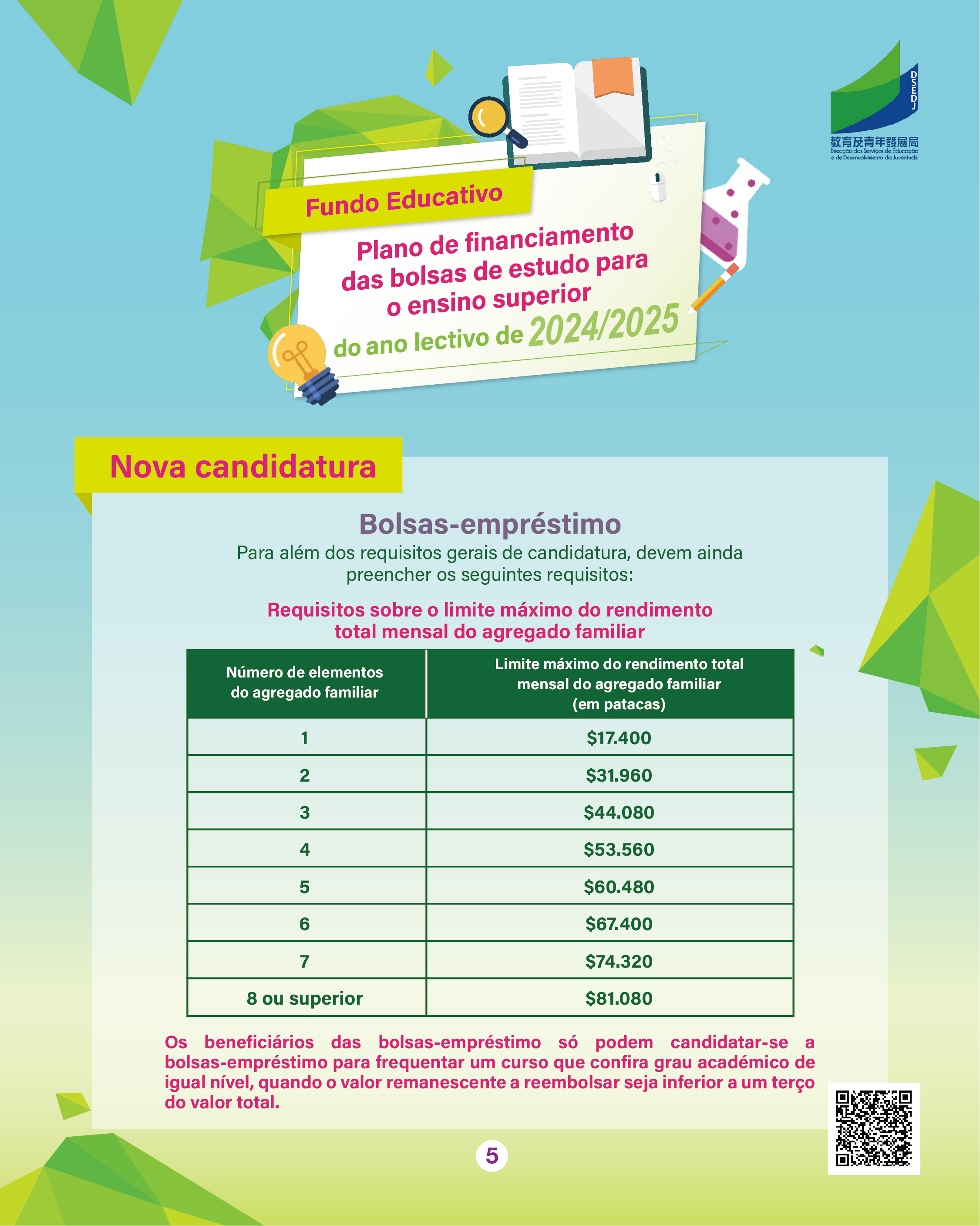 Para mais informações, podem consultar a página exclusiva do “Plano de Financiamento das Bolsas de Estudo para o Ensino Superior” (https://portal.dsedj.gov.mo/webdsejspace/internet/Inter_main_page.jsp?id=8744&langsel=P&).