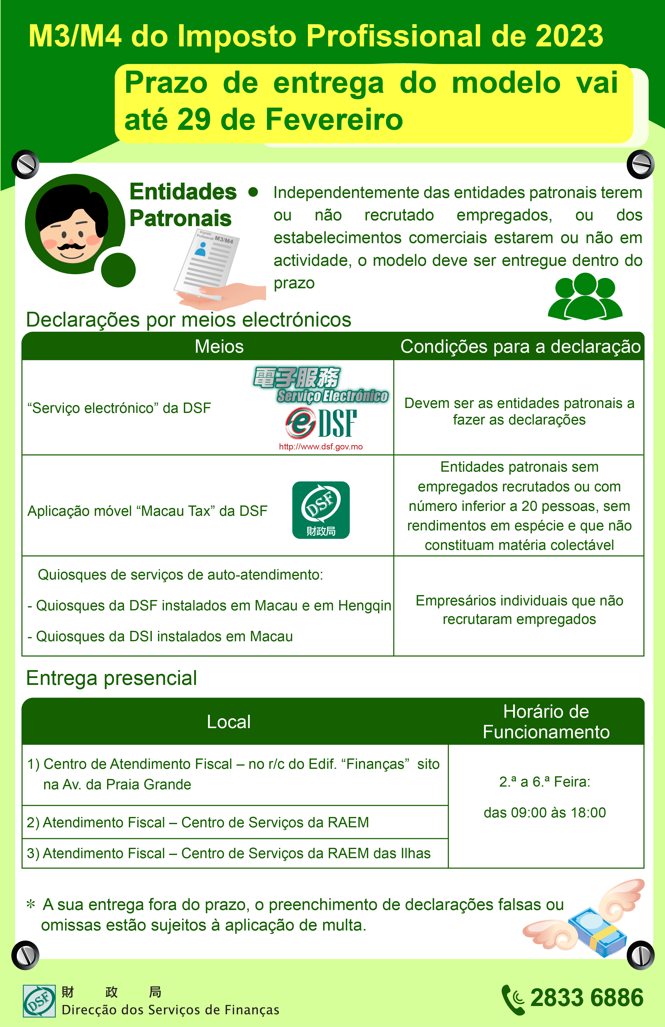 Para mais informações ligue para a Linha Aberta para informações fiscais através do n.º 2833 6886.
