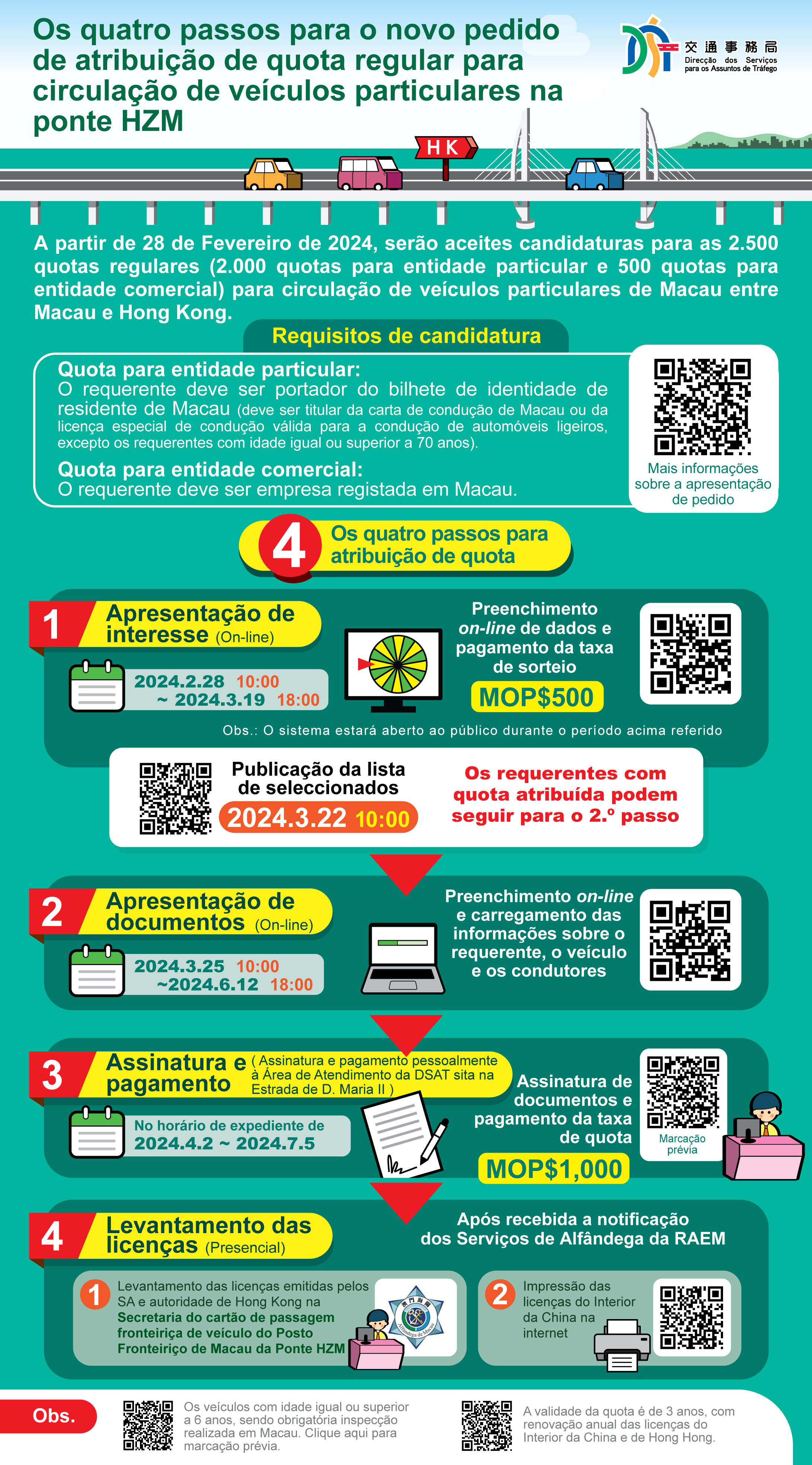 Para atender às necessidades dos residentes que desejam utilizar a ponte Hong Kong-Zhuhai-Macau (ponte HZM) para se deslocarem entre Macau e Hong Kong, o Governo da RAEM anunciou o lançamento de 2.500 quotas regulares para a circulação entre Macau e Hong Kong, destinadas a veículos particulares da RAEM. Do total, 2.000 quotas correspondem a entidades particulares e 500 são destinadas a entidades comerciais. Para se inscrever, os requerentes devem cumprir os seguintes requisitos: