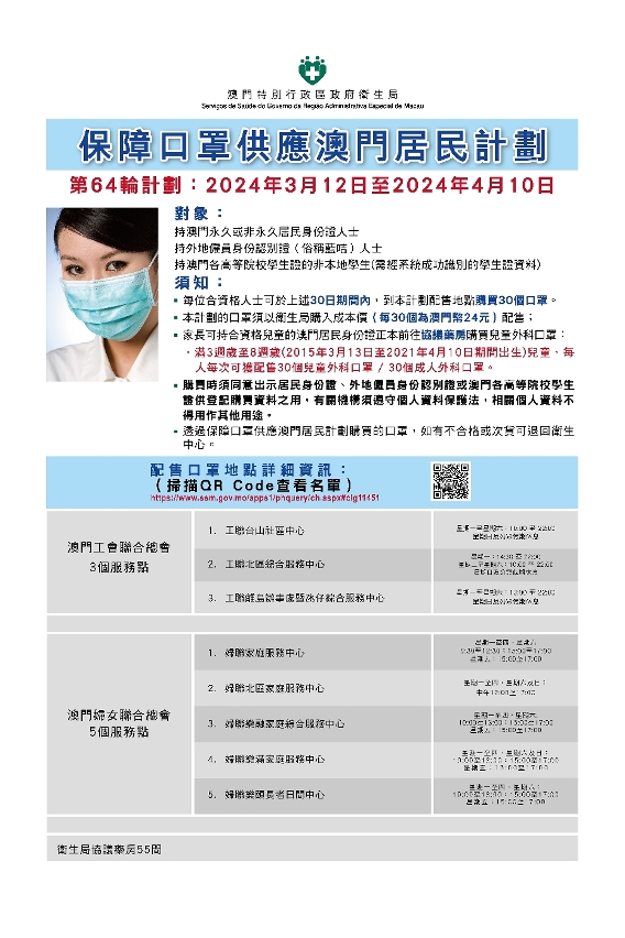 Os Serviços de Saúde informam hoje (dia 8) que, será lançado o 64.º Programa de fornecimento de máscaras aos residentes de Macau a partir de 12 de Março de 2024, conforme a seguir discriminado: