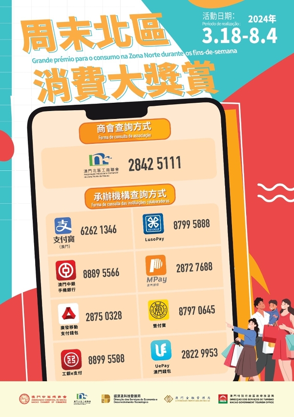 O “Grande prémio para o consumo na Zona Norte durante os fins-de-semana” decorre entre 18 de Março a 4 de Agosto, com a duração de 20 semanas. Durante as 2.ª a 6.ª feiras no período da actividade, todos os utilizadores que utilizem as carteiras electrónicas das entidades colaboradoras, e que sejam autenticadas com o nome verdadeiro, quando fizerem compras em todas as lojas online e offline de Macau, e pagarem através de telemóvel, no valor de 50 patacas, por cada transacção, podem sortear 3 vezes para obter benefícios electrónicos. Esses benefícios electrónicos devem ser utilizados nos sábados e domingos seguintes, nas lojas offline aderentes da Zona Norte.