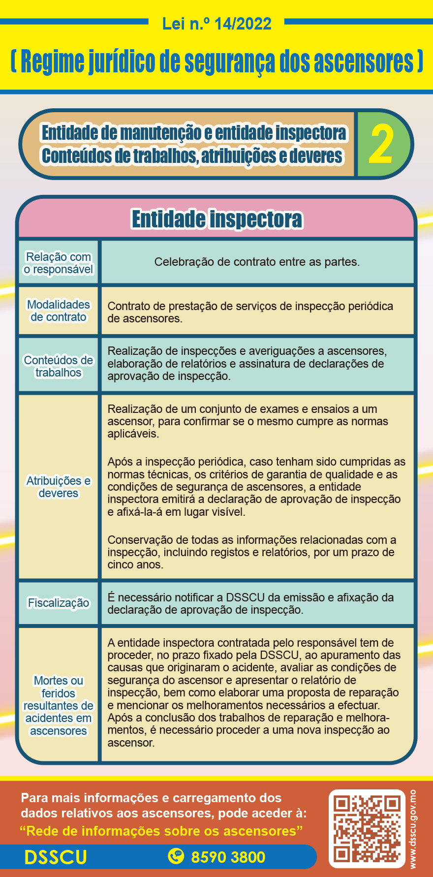 A entidade inspectora responsabiliza-se pela realização de inspecções e averiguações aos ascensores, pela elaboração de relatórios e por assinar a declaração de aprovação de inspecção. Os ascensores estão sujeitos a inspecções antes da conclusão do registo e da sua entrada em funcionamento. Posteriormente, também estão sujeitos a inspecções periódicas anuais mediante uma série de inspecções e ensaios a realizar pela entidade inspectora, a fim de garantir a sua conformidade com as normas legais. Depois de efectuada a inspecção periódica e verificado o cumprimento das normas técnicas, dos critérios de garantia de qualidade e das condições de segurança dos ascensores, a entidade inspectora tem de emitir e assinar a declaração de aprovação de inspecção e afixá-la, em lugar visível, no interior do ascensor ou junto ao acesso à escada mecânica, e notificar também a DSSCU do assunto.