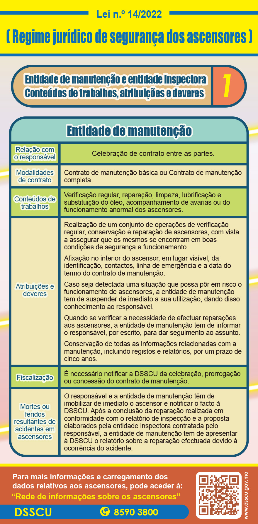 A segurança dos ascensores está estreitamente relacionada com a vida de milhares de famílias, pelo que a sua manutenção e inspecções periódicas são extremamente importantes. A Lei n.º 14/2022 (Regime jurídico de segurança dos ascensores) e respectiva regulamentação entrarão em vigor na próxima segunda-feira (1 de Abril). Através de uma gestão sistematizada e normalizada, estabelecem claramente os respectivos trabalhos e responsabilidades e da entidade de manutenção e da entidade inspectora, assegurando uma melhor segurança na utilização dos ascensores. Em articulação com a implementação de legislação, os ascensores já em funcionamento devem ser registados junto da Direcção dos Serviços de Solos e Construção Urbana (DSSCU) até ao final do corrente mês, de modo a que os trabalhos de manutenção e inspecção sejam realizados de acordo com as novas exigências