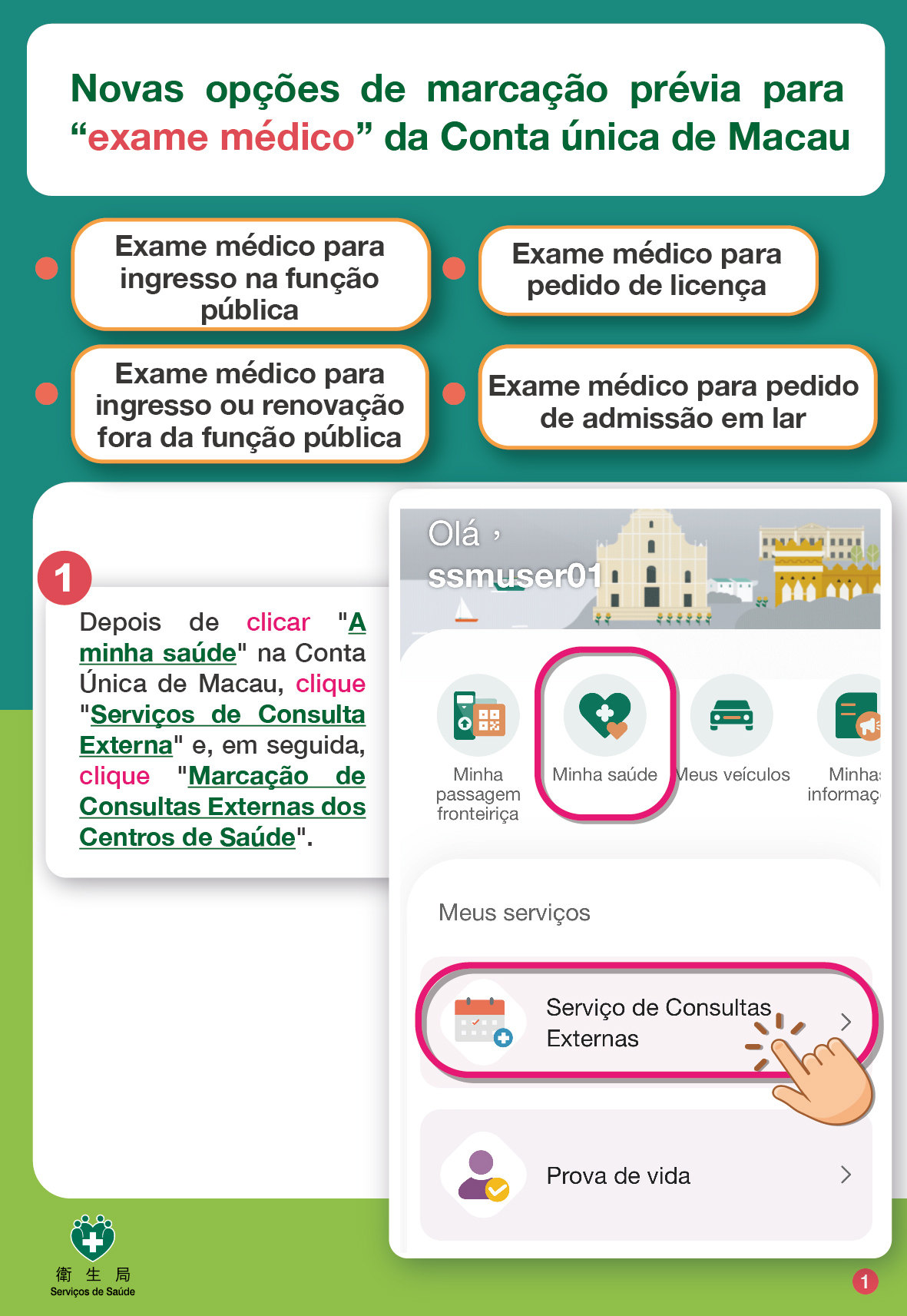 Para efectuar a marcação online do exame médico (através de qualquer uma das formas acima referidas), deve seguir os seguintes passos: clique sucessivamente "A minha saúde" > "Serviços de Consulta Externa" > "Marcação de Consultas Externas dos Centros de Saúde" > "exame médico", e, por último, escolha o tipo de exame médico pretendido. Depois concluída a marcação com sucesso, irá receber uma mensagem de texto via telemóvel. O serviço de exame médico deve ser marcado com 14 dias de antecedência. Pode consultar o registo de marcação de consulta externa dos Centros de Saúde em "Serviços de Consulta Externa" acima referido, bem como pode proceder à alteração da data de marcação ou cancelamento da marcação, entre outros serviços.