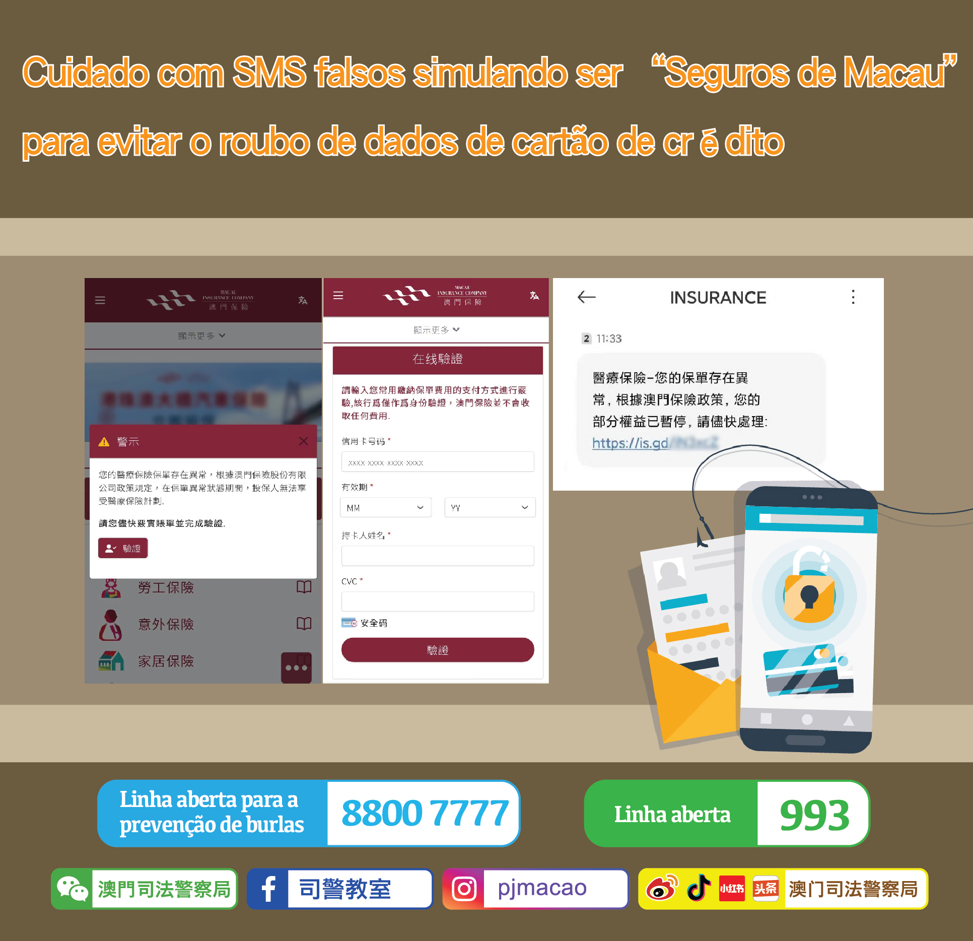 A Polícia Judiciária (PJ) descobriu burlas hoje cujos autores se faziam passar pela “Companhia de Seguros de Macau”, enviando mensagens de texto aos cidadãos a dizer que havia anormalidade nos seus seguros de saúde e encaminhando os interessados a clicarem em links contidos naquela mesma mensagem para fazerem a verificação do seguro. Contudo, ao fazer-se o clique nos referidos links, as pessoas eram levadas a um site falso da “Companhia de Seguros de Macau” tratando-se, portanto, de um esquema para obter informações pessoais do utilizador e do seu cartão de crédito.