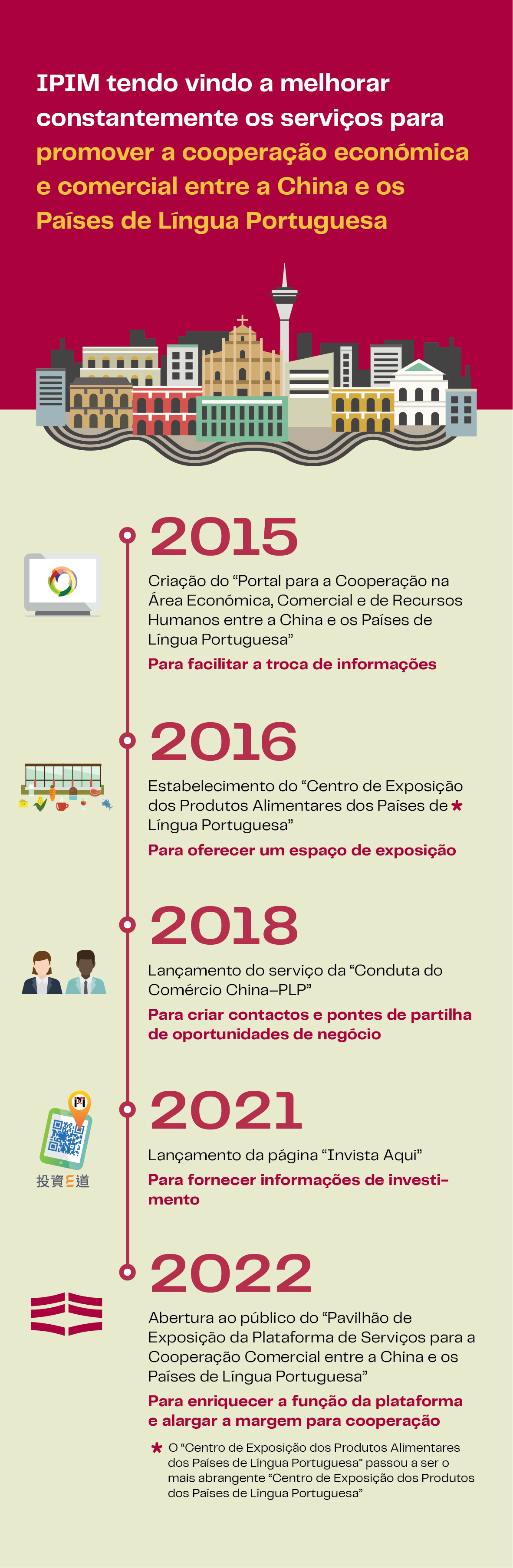 O Instituto de Promoção do Comércio e do Investimento de Macau (IPIM), como organismo da RAEM responsável pela promoção da cooperação económica e comercial entre a China e os Países de Língua Portuguesa, tem dedicado o seu esforço ao desenvolvimento de Macau enquanto plataforma sino-lusófona a partir de diversas vertentes, nomeadamente promoção do comércio externo, captação de investimentos e desenvolvimento de convenções e exposições, com o objectivo de incentivar a cooperação entre as empresas, em particular as pequenas e médias empresas, da China e dos Países de Língua Portuguesa em áreas como comércio. Em adição, em articulação com a estratégia de desenvolvimento da diversificação adequada “1+4” proposta pelo Governo nos últimos anos e de acordo com as necessidades de desenvolvimento das empresas chinesas e lusófonas nas diferentes fases da sua exploração do mercado, o IPIM tem vindo a diversificar e aperfeiçoar, de forma contínua, os seus serviços online e presenciais. Entre estes, destacam-se o lançamento do “Portal para a Cooperação na Área Económica, Comercial e de Recursos Humanos entre a China e os Países de Língua Portuguesa” e da página “Invista Aqui”; a oferta do serviço “Conduta do Comércio China–PLP” e a oferta do Serviço “One-Stop” para Investidores; o estabelecimento do “Pavilhão de Exposição da Plataforma de Serviços para a Cooperação Comercial entre a China e os Países de Língua Portuguesa”; e a realização de bolsas de contactos temáticas e de visitas a bairros comunitários de Macau a favor dos comerciantes dos Países de Língua Portuguesa que participam em actividades de convenções e exposições organizadas/coordenadas pelo IPIM, para maximizar a sinergia de “indústrias + convenções e exposições”. Todo este esforço visa criar cenários diversificados e pontes de contacto e intercâmbio para as empresas, que, aliados a uma série de trabalhos direccionados em emparelhamento e acompanhamento antes, durante e após o processo, contribuem para transformar as possibilidades de cooperação entre as empresas chinesas e lusófonas em resultados concretos.