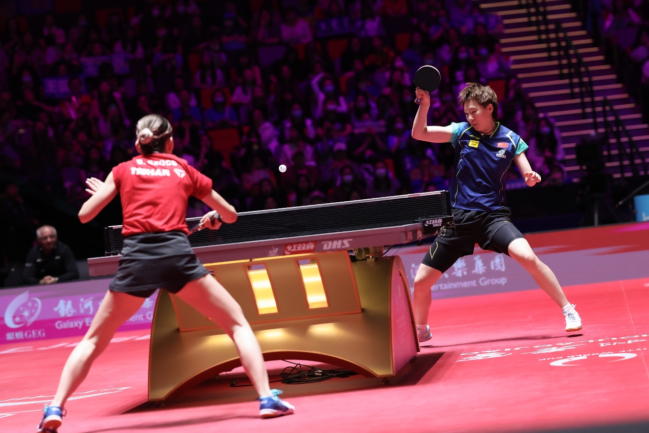 Na Taça Mundial Feminina, CHEN Meng, SUN Yingsha e WANG Manyu apuraram-se para os quartos de final. CHEN Meng, a defender o seu título de campeã, derrotou Suthasini SAWETTABUT da Tailândia por 4:0, enquanto SUN Yingsha e WANG Manyu venceram as respectivas adversárias CHEN Xingtong e Bernadette SZOCS da Roménia por 4:1. WANG Yidi foi derrotada pela jogadora japonesa Miwa HARIMOTO por 1:4, sendo eliminada dos quartos de final. No outro jogo, Hina HAYATA do Japão derrotou SHIN Yubin da República da Coreia com uma vitória estreita por 4:3, apurando-se para os quartos de final.