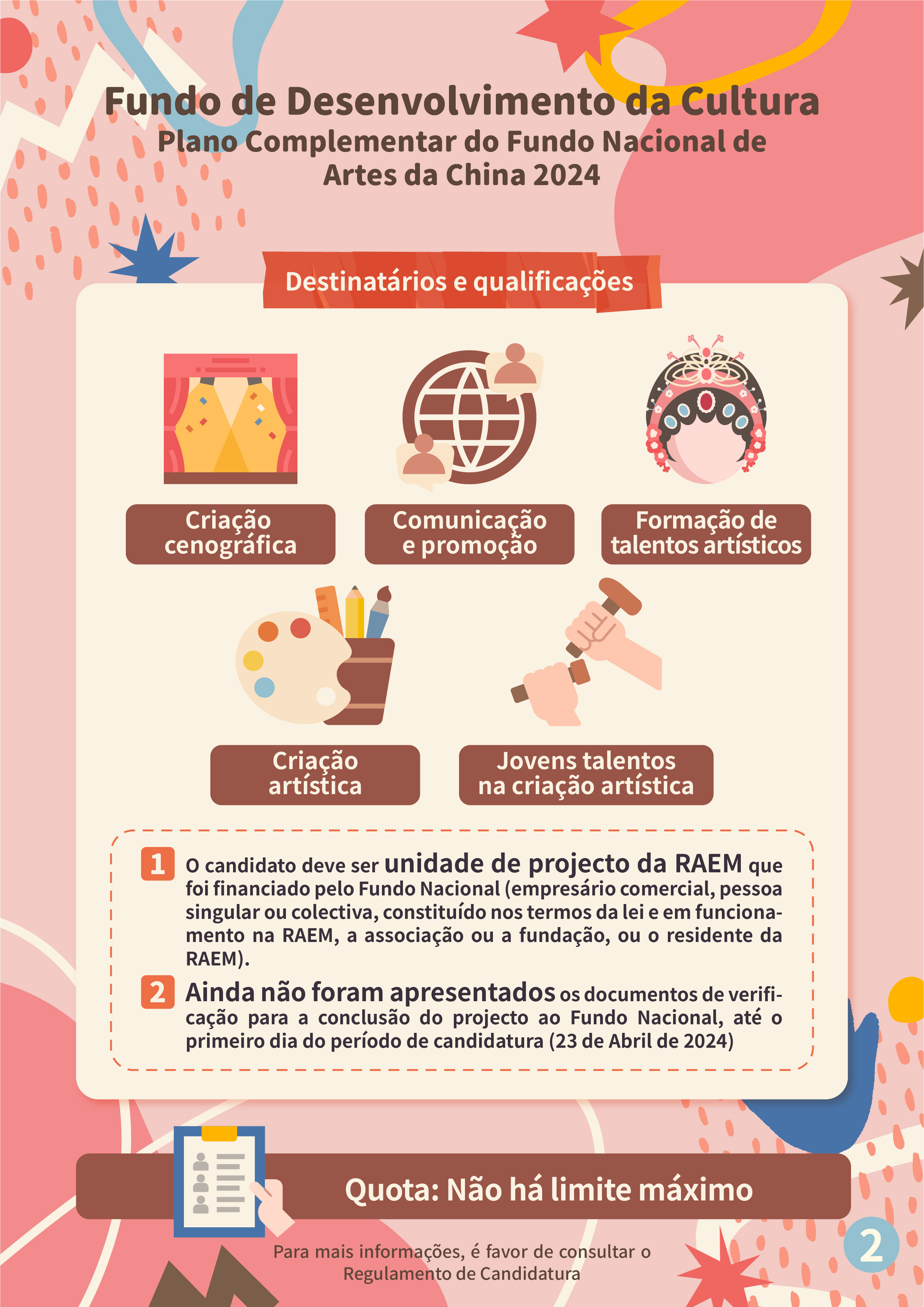 O candidato deve ser unidade de projecto da RAEM que foi financiado pelo Fundo Nacional no âmbito de “criação cenográfica”, “comunicação e promoção”, “formação de talentos artísticos”, bem como “criação artística” e “jovens talentos na criação artística”, devendo ainda ser o empresário comercial, pessoa singular ou colectiva, constituído nos termos da lei e em funcionamento na RAEM, a associação ou a fundação, ou o residente da RAEM. Os documentos de verificação para a conclusão dos projectos candidatos não devem ter sido apresentados ao Fundo Nacional, até 23 de Abril de 2024.