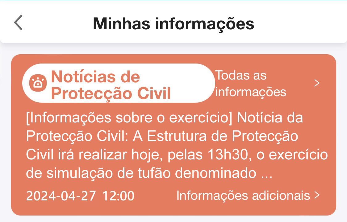 Tendo em conta a aproximação da época de tufões e, para que os cidadãos fiquem mais familiarizados com o acesso às informações de protecção civil na Conta Única, ser-lhes-ão enviadas, no dia do exercício “Peixe de Cristal”, as notificações push a esse respeito por meio da Conta Única. Os cidadãos que pretendem consultar as informações mais detalhadas podem tocar directamente na notificação push em causa, ou consultá-las em “Notícias de Protecção Civil” constantes das “Minhas informações” da Conta Única.