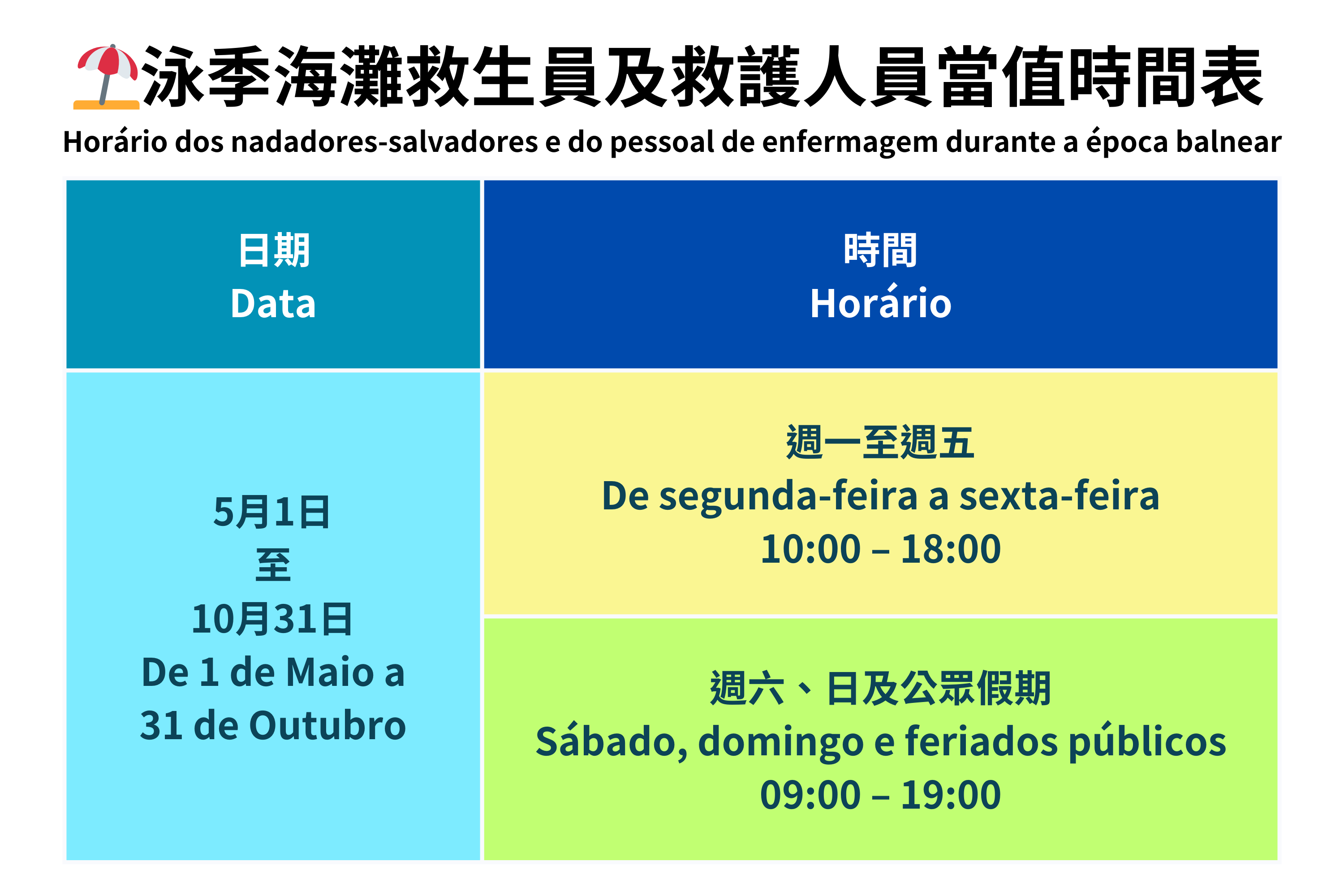 • Horário dos nadadores-salvadores e do pessoal de enfermagem durante a época balnear