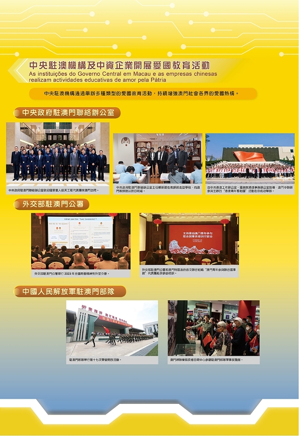 Quanto à educação patriótica, o Gabinete de Ligação do Governo Central em Macau, o Comissariado do Ministério dos Negócios Estrangeiros em Macau e a Guarnição em Macau organizam continuamente diversas actividades educativas de amor pela Pátria, de forma a aprofundar o sentimento de “amor à Pátria e a Macau” de todos os sectores da sociedade. Entretanto, quanto à sensibilização e educação sobre a segurança do Estado, o governo e em conjunto com todos os sectores da sociedade, têm organizado diferentes tipos de actividades para aumentar a responsabilidade do público no âmbito da salvaguarda da segurança nacional.